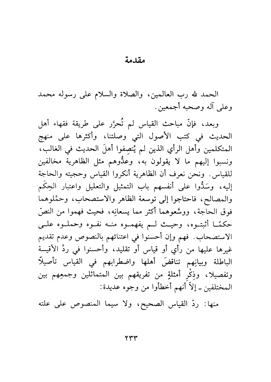 الحمد لله رب العالمين، والصلاة والسلام على رسوله محمد وعلى آله وصحبه أجمعين. وبعد، فإن مباحث القياس لم تُحرَّر على طريقة فقهاء أهل الحديث في كتب الأصول التي وصلتنا، وأكثرها على منهج المتكلمين وأهل الرأي الذين لم يُنصِفوا أهلَ الحديث في الغالب، ونسبوا إليهم ما لا يقولون به، وعدُّوهم مثل الظاهرية مخالفين للقياس. ونحن نعرف أن الظاهرية أنكروا القياس وحجيته والحاجة إليه، وسَدوا على أنفسهم باب التمثيل والتعليل واعتبار الحِكَم والمصالح، فاحتاجوا إلى توسعة الظاهر والاستصحاب، وحمَّلوهما فوق الحاجة، ووسَّعوهما أكثر مما يسعانِه، فحيث فهموا من النص حكمًا أثبتوه، وحيث لم يفهموه منه نفوه وحملوه على الاستصحاب. فهم وإن أحسنوا في اعتنائهم بالنصوص وعدم تقديم غيرها عليها من رأي أو قياس أو تقليد، وأحسنوا في رد الأقيسة الباطلة وبيانِهم تناقضَ أهلها واضطرابهم في القياس تأصيلاً وتفصيلا، وذِكْرِ أمثلةِ من تفريقهم بين المتماثلين وجمعِهم بين المختلفين- إلاّ أنهم أخطأوا من وجوه عديدة: