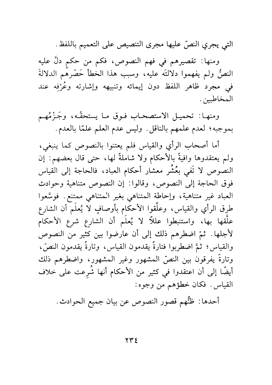 أما أصحاب الرأي والقياس فلم يعتنوا بالنصوص كما ينبغي، ولم يعتقدوها وافيةً بالأحكام ولا شاملةً لها، حتى قال بعضهم: إن النصوص لا تَفي بعُشُر معشار أحكام العباد، فالحاجة إلى القياس فوق الحاجة إلى النصوص، وقالوا: إن النصوص متناهية وحوادث العباد غير متناهية، وإحاطة المتناهي بغير المتناهي ممتنع. فوسَّعوا طرق الرأي والقياس، وعلَّقوا الأحكام بأوصافٍ لا يُعلَم أن الشارع علَّقها بها، واستنبطوا عللاً لا يُعلَم أن الشارم شرع الأحكام لأجلها. ثمّ اضطرهم ذلك إلى أن عارضوا بين كثير من النصوص والقياس؟ ثمَّ اضطربوا فتارةً يقدمون القياس، وتارةً يقدمون النصّ، وتارةً يفرقون بين النصّ المشهور وغير المشهور، واضطرهم ذلك أيضًا إلى أن اعتقدوا في كثير من الأحكام أنها شرِعت على خلاف القياس. فكان خطؤهم من وجوه: