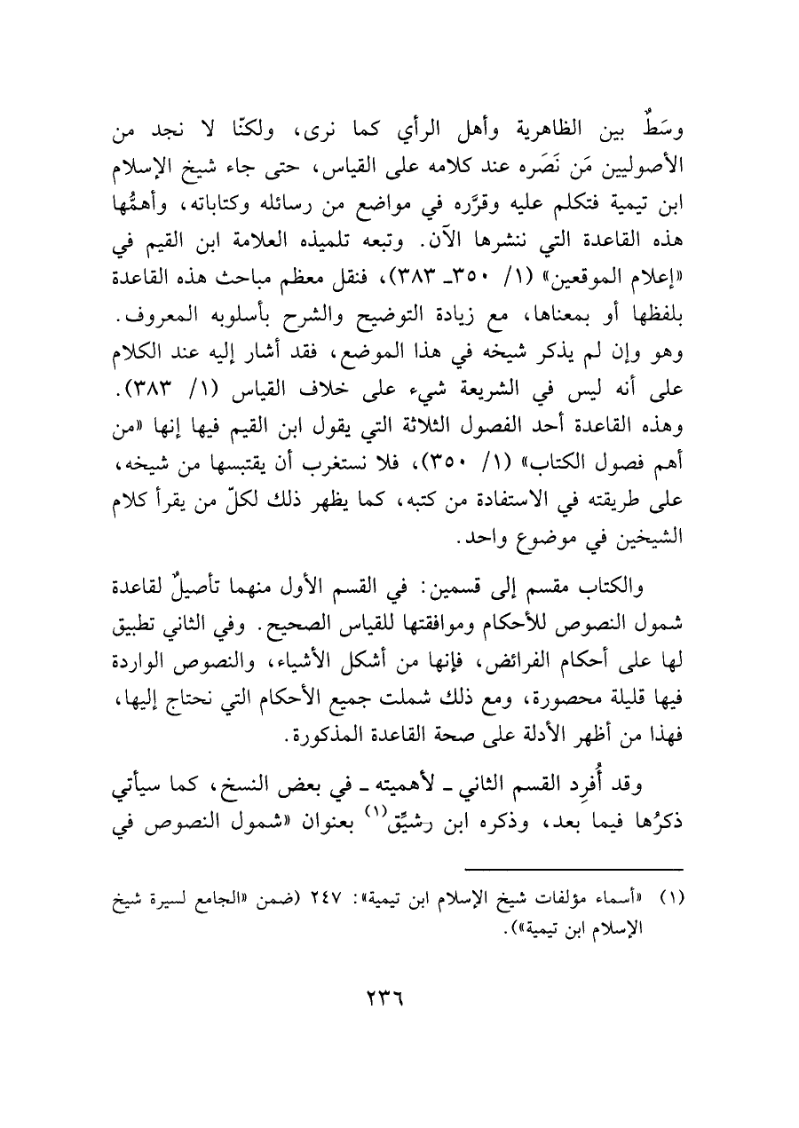 وسَط بين الظاهرية وأهل الرأي كما نرى، ولكنا لا نجد من الأصوليين مَن نَصَره عند كلامه على القياس، حتى جاء شيخ الإسلام ابن تيمية فتكلم عليه وقرره في مواضع من رسائله وكتاباته، وأهمُّها هذه القاعدة التي ننشرها الآن. وتبعه تلميذه العلامة ابن القيم في "إعلام الموقعين" (١/ ٣٥٠ - ٣٨٣)، فنقل معظم مباحث هذه القاعدة بلفظها أو بمعناها، مع زيادة التوضيح والشرح بأسلوبه المعروف.