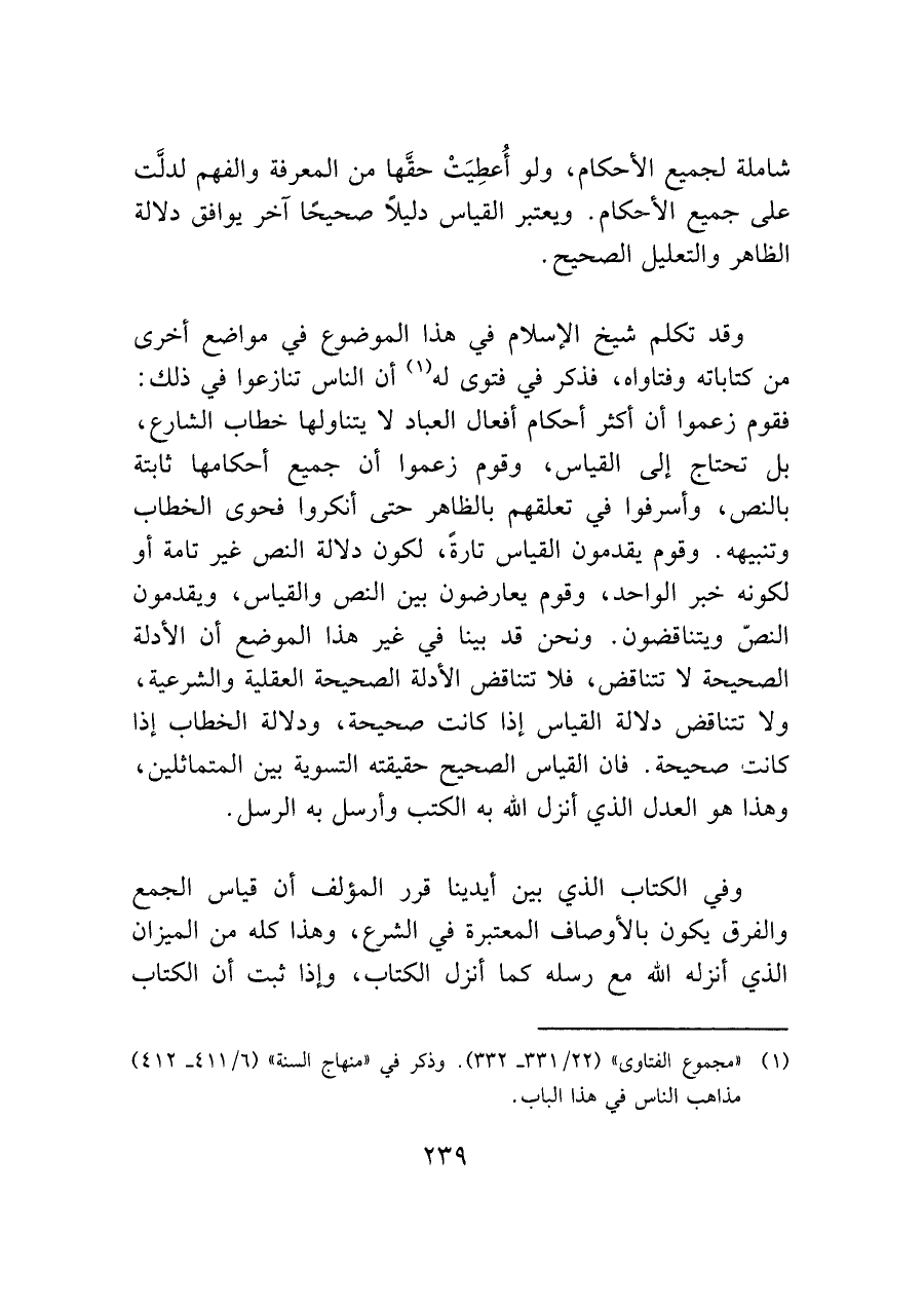 وقد تكلم شيخ الإسلام في هذا الموضوع في مواضع أخرى من كتاباته وفتاواه، فذكر في فتوى له (¬١) أن الناس تنازعوا في ذلك: فقوم زعموا أن أكثر أحكام أفعال العباد لا يتناولها خطاب الشارع، بل تحتاج إلى القياس، وقوم زعموا أن جميع أحكامها ثابتة بالنص، وأسرفوا في تعلقهم بالظاهر حتى أنكروا فحوى الخطاب وتنبيهه. وقوم يقدمون القياس تارةً، لكون دلالة النص غير تامة أو لكونه خبر الواحد، وقوم يعارضون بين النص والقياس، ويقدمون النص ويتناقضون. ونحن قد بينا في غير هذا الموضع أن الأدلة الصحيحة لا تتناقض، فلا تتناقض الأدلة الصحيحة العقلية والشرعية، ولا تتناقض دلالة القياس إذا كانت صحيحة، ودلالة الخطاب إذا كانت صحيحة. فان القياس الصحيح حقيقته التسوية بين المتماثلين، وهذا هو العدل الذي أنزل الله به الكتب وأرسل به الرسل.