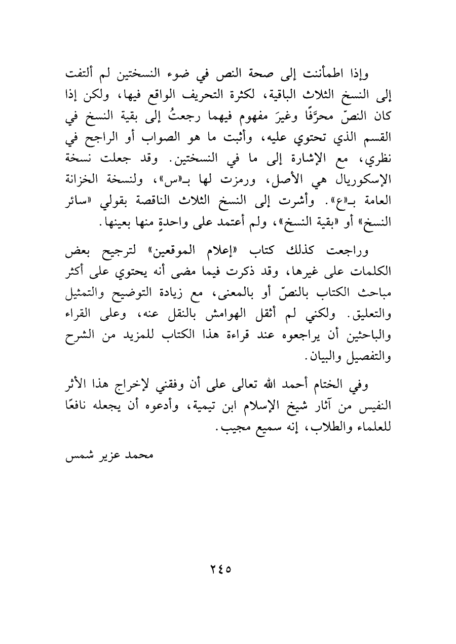 وراجعت كذلك كتاب "إعلام الموقعين" لترجيح بعض الكلمات على غيرها، وقد ذكرت فيما مضى أنه يحتوي على أكثر مباحث الكتاب بالنصّ أو بالمعنى، مع زيادة التوضيح والتمثيل والتعليق. ولكني لم أثقل الهوامش بالنقل عنه، وعلى القراء والباحثين أن يراجعوه عند قراءة هذا الكتاب للمزيد من الشرح والتفصيل والبيان.