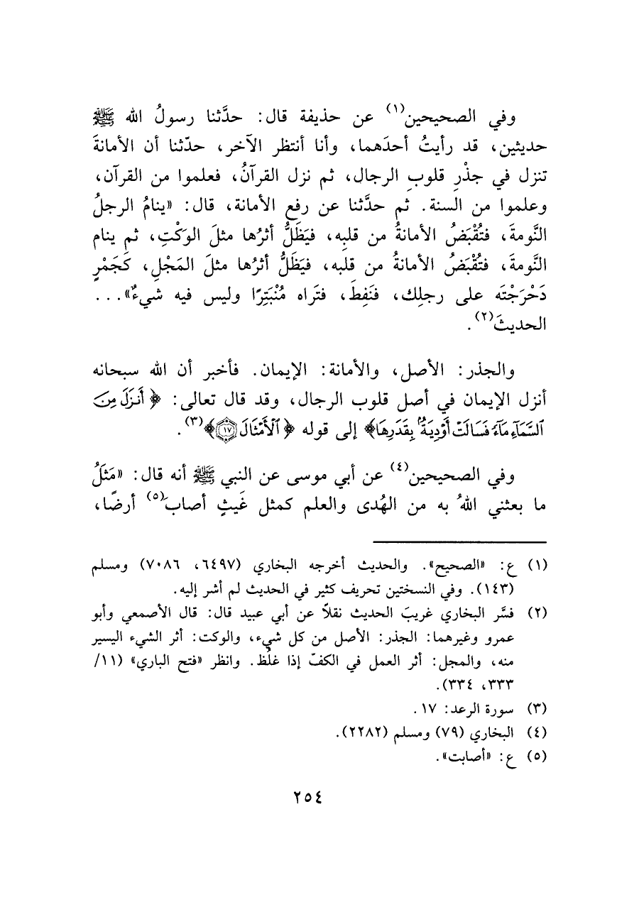 والجذر: الأصل، والأمانة: الإيمان. فأخبر أن الله سبحانه أنزل الإيمان في أصل قلوب الرجال، وقد قال تعالى: (أَنْزَلَ مِنَ السَّمَاءِ مَاءً فَسَالَتْ أَوْدِيَةٌ بِقَدَرِهَا) (الْأَمْثَالَ (١٧)) إلى قوله (الْأَمْثَالَ (١٧)) (¬٣).