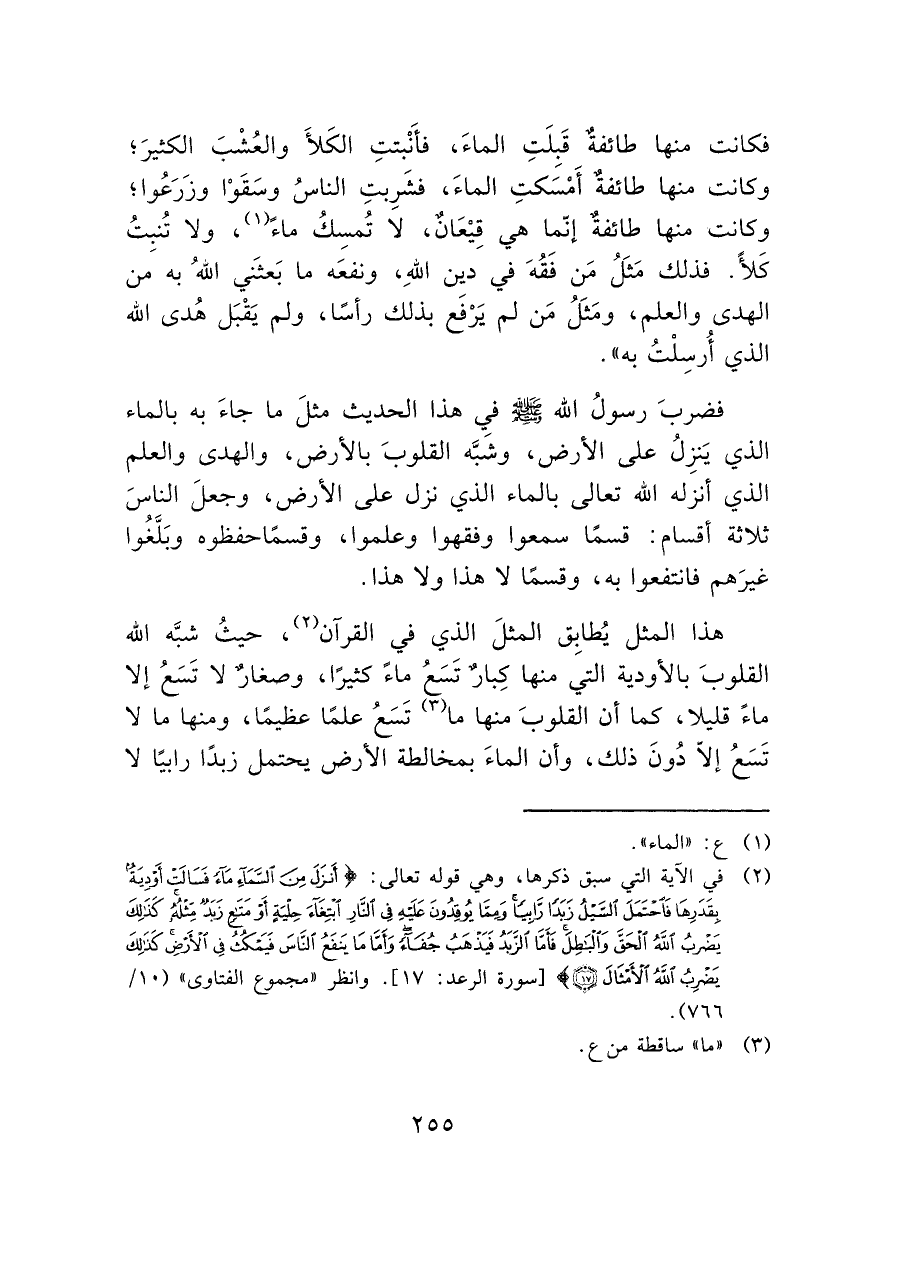 هذا المثل يُطابق المثلَ الذي في القرآن (¬٢)، حيثُ شبَّه الله القلوبَ بالأودية التيَ منها كِبار تَسَعُ ماءً كثيرًا، وصغار لا تَسَعُ إلاّ ماءً قليلا، كما أن القلوبَ منها ما (¬٣) تَسَعُ علمًا عظيمًا، ومنها ما لا تَسَعُ إلاّ دُونَ ذلك، وأن الماءَ بمخالطة الأرض يحتمل زبداً رابيًا لا