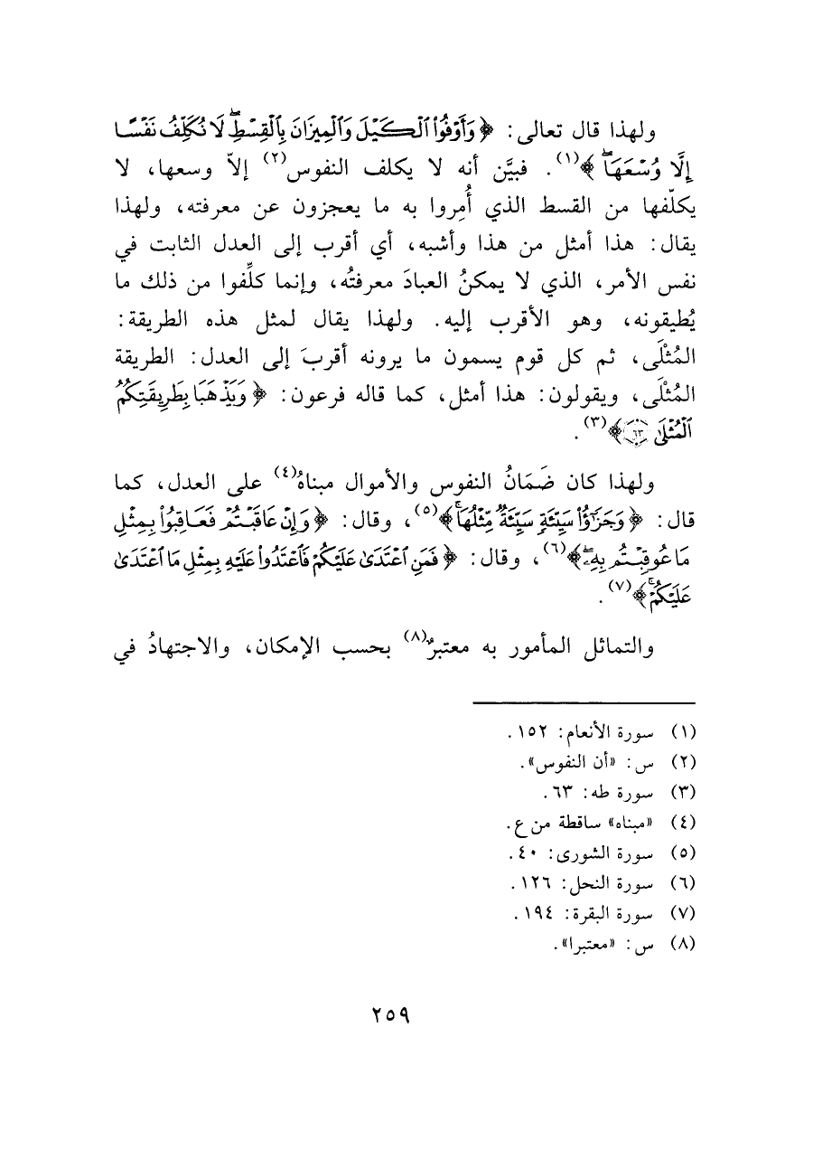 ولهذا قال تعالى: (وَأَوْفُوا الْكَيْلَ وَالْمِيزَانَ بِالْقِسْطِ لا نُكَلِّفُ نَفْساً إِلَّا وُسْعَهَا) (¬١). فبيَّن أنه لا يكلف النفوس (¬٢) إلاّ وسعها، لا يكلّفها من القسط الذي أُمِروا به ما يعجزون عن معرفته، ولهذا يقال: هذا أمثل من هذا وأشبه، أي أقرب إلى العدل الثابت في نفس الأمر، الذي لا يمكنُ العبادَ معرفتُه، وإنما كلِّفوا من ذلك ما يُطيقونه، وهو الأقرب إليه. ولهذا يقال لمثل هذه الطريقة: المُثْلَى، ثم كل قوم يسمون ما يرونه أقربَ إلى العدل: الطريقة المُثْلَى، ويقولون: هذا أمثل، كما قاله فرعون: (ويذهبا بطريقتكم المثلى (٦٣)) (¬٣).