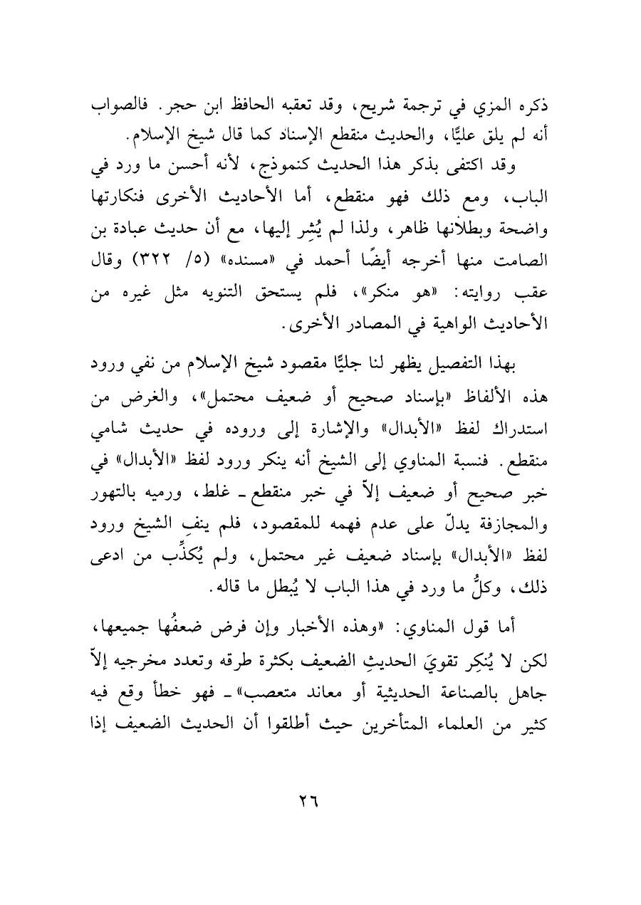 بهذا التفصيل يظهر لنا جليّاً مقصود شيخ الإسلام من نفي ورود هذه الألفاظ "بإسناد صحيح أو ضعيف محتمل"، والغرض من استدراك لفظ "الأبدال" والإشارة إلى وروده في حديث شامي منقطع. فنسبة المناوي إلى الشيخ أنه ينكر ورود لفظ "الأبدال" في خبر صحيح أو ضعيف إلاّ في خبر منقطع- غلط، ورميه بالتهور والمجازفة يدلّ على عدم فهمه للمقصود، فلم ينفِ الشيخ ورود لفظ "الأبدال" بإسناد ضعيف غير محتمل، ولم يُكذِّب من ادعى ذلك، وكلُّ ما ورد في هذا الباب لا يُبطل ما قاله.