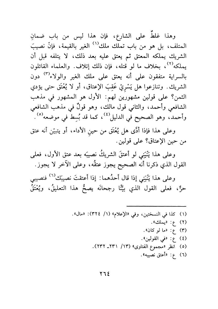 وهذا غلطٌ على الشارع، فإن هذا ليس من باب ضمانِ المتلف، بل هو من باب تملك ملك (¬١) الغير بالقيمة، فإنّ نصيبَ الشريك يملكه المعتق ثم يعتق عليه بعد ذلك، لا يتلفه قبل أن يملكه (¬٢)، بخلاف ما لو قتله، فإن ذلك إتلاف. والعلماء القائلون بالسراية متفقون على أنه يعتق على ملك الغير والولاء (¬٣) دون الشريك. وتنازعوا هل يَسْرِيْ عَقِبَ الإعتاق، أو لا يُعْتَق حتى يؤدي الثمن؟ على قولين مشهورين لهم: الأول هو المشهور في مذهب الشافعي وأحمد، والثاني قول مالك، وهو قول في مذهب الشافعي وأحمد، وهو الصحيح في الدليل (¬٤)، كما قد بُسِط في موضعه (¬٥).