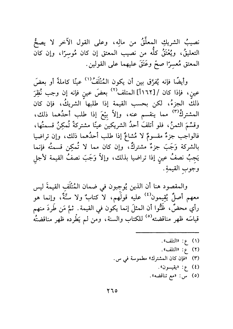وأيضا فإنه يُفرَّق بين أن يكون المُتْلَفُ (¬١) عينَا كاملة أو بعضَ عينِ، فإذا كان/ [١٦٢ أ]، المتلف (¬٢) بعضَ عينٍ فإنه إن وجب نُظِرَ ذلك الجزءُ، لكن بحسب القيمة إذا طلبها الشريكُ، فإن كان المشتركُ (¬٣) مما ينقسم عنه، وإلّا بيْعَ إذا طلب أحدُهما ذلك، وقسمَ الثمنُ، فلو أتلفَ أحدُ الشريكينَ عينَا مشتركة تُمكِنُ قسمتُها، فالواجب جز مقسوم لا مُشاع إذا طلب أحدُهما ذلك، وإن تراضيا بالشركة وَجَبَ جزءٌ مشترك، وإن كان مما لا تُمكِن قسمتُه فإنما يَجِبُ نصفُ عينٍ إذا تراضيا بذلك، وإلّا وَجَبَ نصفُ القيمة لأجلِ وجوبِ القيمةِ.