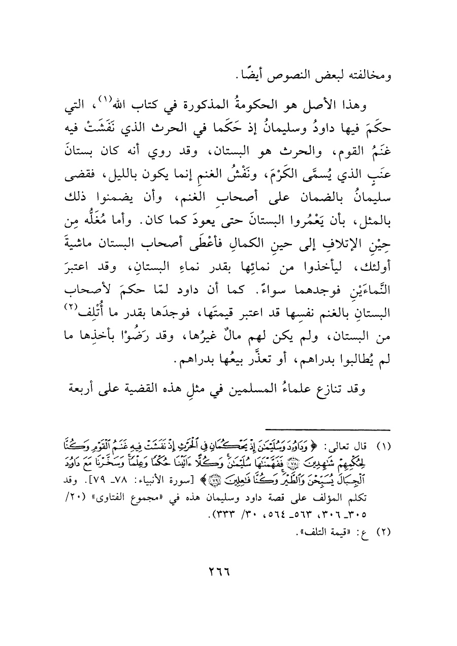 (¬١) قال تعالى: (وَدَاوُودَ وَسُلَيْمَانَ إِذْ يَحْكُمَانِ فِي الْحَرْثِ إِذْ نَفَشَتْ فِيهِ غَنَمُ الْقَوْمِ وَكُنَّا لِحُكْمِهِمْ شَاهِدِينَ (٧٨) فَفَهَّمْنَاهَا سُلَيْمَانَ وَكُلًّا آَتَيْنَا حُكْمًا وَعِلْمًا وَسَخَّرْنَا مَعَ دَاوُودَ الْجِبَالَ يُسَبِّحْنَ وَالطَّيْرَ وَكُنَّا فَاعِلِينَ) [سورة الأنبياء: ٧٨ - ٧٩]. وقد تكلم المؤلف على قصة داود وسليمان هذه في "مجموع الفتاوى" (٢٠/ ٣٠٥ - ٣٠٦، ٥٦٣ - ٥٦٤، ٣٠/ ٣٣٣).