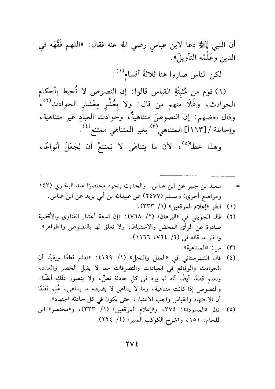 (¬٤) قال الشهرستاني في "الملل والنحل" (١/ ١٩٩): "تعلم قطعاً ويقينا أن الحوادث والوقائع في العبادات والتصرفات مما لا يقبل الحصر والعدد، ونعلم قطعَا أيضًا أنه لم يرد في كل حادثة نصٌ، ولا يتصور ذلك أيضًا.