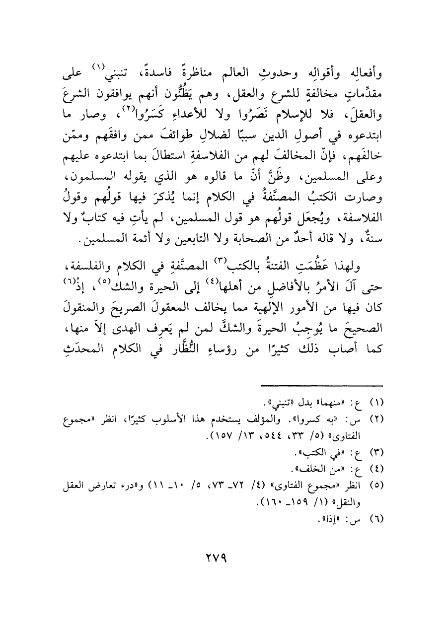 ولهذا عَظُمَتِ الفتنةُ بالكتب (¬٣) المصنَّفةِ في الكلام والفلسفة، حتى آل الأمرُ بالأفاضلِ من أهلها (¬٤) إلى الحيرة والشك (¬٥)، إذْ (¬٦) كان فيها من الأمور الإلهية مما يخالف المعقول الصريحَ والمنقول الصحيحَ ما يُوجبُ الحيرةَ والشك لمن لم يَعرِف الهدى إلاّ منها، كما أصاب ذلكَ كثيرًا من رؤساءِ النظار في الكلام المحدَثِ