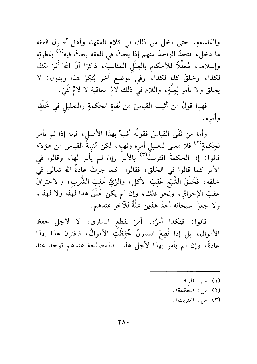 والفلسفةِ، حتى دخل من ذلك في كلام الفقهاء وأهلِ أصول الفقه ما دخل، فتجدُ الواحدَ منهم إذا بحثَ في الفقه بحثَ فيه (¬١) بفطرتِه وإسلامه، مُعلِّلاً للأحكام بالعِلَلِ المناسبة، ذاكرًا أنّ اللهَ أَمَرَ بكذا لكذا، وخلقَ كذا لكذا، وفي موضع آخر يُنكِرُ هذا ويقول: لا يخلق ولا يأمر لِعِلةِ، واللام في ذلك لامُ العاقبة لا لامُ كَيْ.