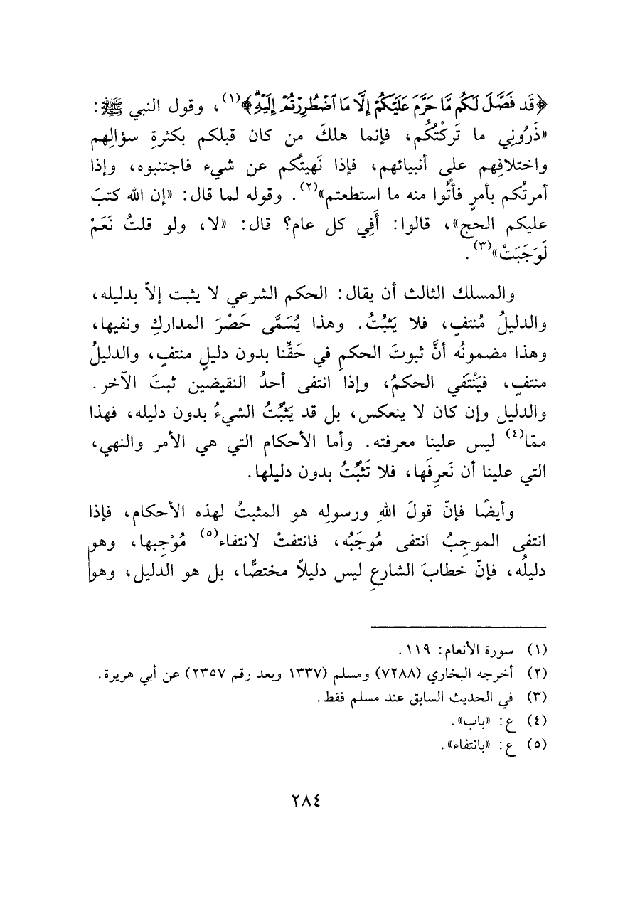 "ذرُوني ما تَركْتكم، فإنما هلكَ من كان قبلكم بكثرةِ سؤالهم واختلافِهم على أنبيائهم، فإذا نَهيتكم عن شيء فاجتنبوه، وإذا أمرتكم بأمرٍ فأتوا منه ما استطعتم" (¬٢). وقوله لما قال: "إن الله كتبَ عليكم الحج"، قالوا: أَفِي كل عام؟ قال: "لا، ولو قلتُ نَعَمْ لَوَجَبَتْ" (¬٣).