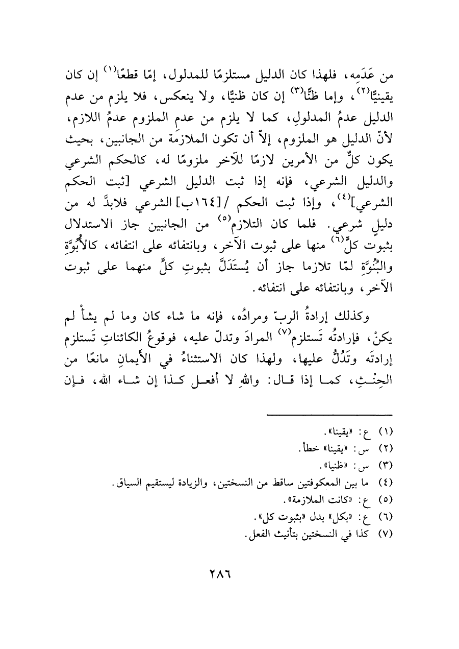 من عَدَمه، فلهذا كان الدليل مستلزمًا للمدلول، إمّا قطعًا (¬١) إن كان يقينيًّا (¬٢)، وإما ظنًّا (¬٣) إن كان ظنيًّا، ولا ينعكس، فلا يلزم من عدم الدليل عدمُ المدلولِ، كما لا يلزم من عدمِ الملزوم عدمُ اللازم، لأنّ الدليل هو الملزوم، إلاّ أن تكون الملازمة من الجانبين، بحيث يكون كلّ من الأمرين لازمَا للآخر ملزومًا له، كالحكم الشرعي والدليل الشرعي، فإنه إذا ثبت الدليل الشرعي [ثبت الحكم الشرعي] (¬٤)، وإذا ثبت الحكم/ [١٦٤ ب] الشرعي فلابدَّ له من دليلٍ شرعي. فلما كان التلازم (¬٥) من الجانبين جاز الاستدلال بثبوت كل (¬٦) منها على ثبوت الآخر، وبانتفائه على انتفائه، كالأبوة والبنوةِ لما تلازما جاز أن يُستَدَلَ بثبوتِ كل منهما على ثبوت الآخر، وبانتفائه على انتفائه.