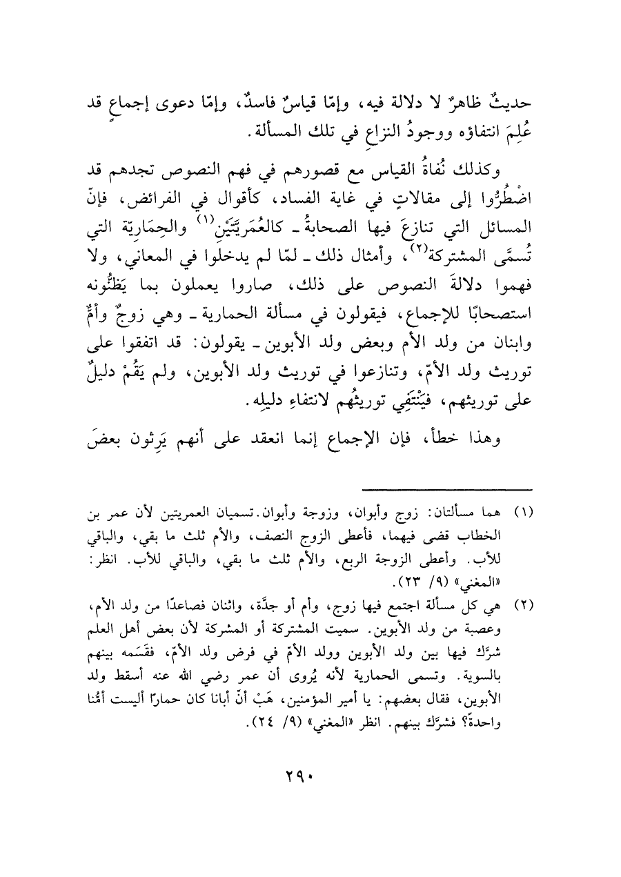 وكذلك نُفاةُ القياس مع قصورهم في فهم النصوص تجدهم قد اضْطُرُّوا إلى مقالات في غاية الفساد، كأقوال في الفرائض، فإنّ المسائل التي تنازعَ فيها الصحابةُ- كالعُمَريتَيْنِ (¬١) والحِمَارِية التي تُسمَّى المشتركة (¬٢)، وأمثال ذلك- لمّا لم يدخلوا في المعاني، ولا فهموا دلالةَ النصوص على ذلك، صاروا يعملون بما يَظنونه استصحابًا للإجماع، فيقولون في مسألة الحمارية -وهي زوجٌ وأمٌّ وابنان من ولد الأم وبعض ولد الأبوين- يقولون: قد اتفقوا على توريث ولد الأمّ، وتنازعوا في توريث ولد الأبوين، ولم يَقُمْ دليلٌ على توريثهم، فيَنْتَفِي توريثُهم لانتفاءِ دليلِه.