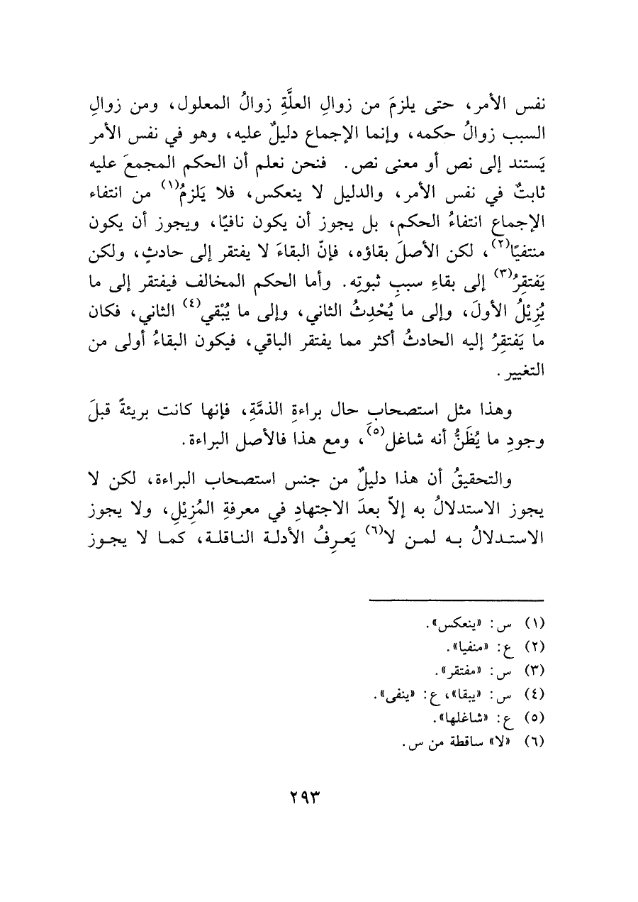نفس الأمر، حتى يلزمَ من زوالِ العلَّة زوالُ المعلول، ومن زوالِ السبب زوالُ حكمه، وإنما الإجماع دليل عليه، وهو في نفس الأمر يَستند إلى نص أو معنى نص. فنحن نعلم أن الحكم المجمعَ عليه ثابتٌ في نفس الأمر، والدليل لا ينعكس، فلا يَلزمُ (¬١) من انتفاء الإجماع انتفاءُ الحكم، بل يجوز أن يكون نافيًا، ويجوز أن يكون منتفيًا (¬٢)، لكن الأصلَ بقاؤه، فإن البقاءَ لا يفتقر إلى حادث، ولكن يَفتقِرُ (¬٣) إلى بقاءِ سببِ ثبوته. وأما الحكم المخالف فيفتقر إلى ما يُزِيْلُ الأولَ، وإلى ما يُحْدِثُ الثاني، وإلى ما يُبْقي (¬٤) الثاني، فكان ما يَفتقِرُ إليه الحادثُ أكثر مما يفتقر الباقي، فيكون البقاءُ أولى من التغيير.