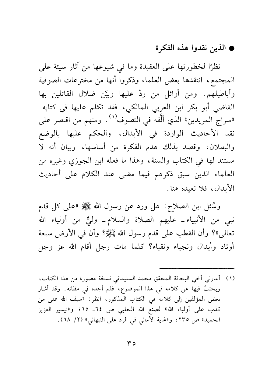 نظرًا لخطورتها على العقيدة وما في شيوعها من آثار سيئة على المجتمع، انتقدها بعض العلماء وذكروا أنها من مخترعات الصوفية وأباطيلهم. ومن أوائل من ردّ عليها وبيَّن ضلال القائلين بها القاضي أبو بكر ابن العربي المالكي، فقد تكلم عليها في كتابه "سراج المريدين " الذي ألَّفه في التصوف (¬١). ومنهم من اقتصر على نقد الأحاديث الواردة في الأبدال، والحكم عليها بالوضع والبطلان، وقصد بذلك هدم الفكرة من أساسها، وبيان أنه لا مستند لها في الكتاب والسنة، وهذا ما فعله ابن الجوزي وغيره من العلماء الذين سبق ذكرهم فيما مضى عند الكلام على أحاديث الأبدال، فلا نعيده هنا.