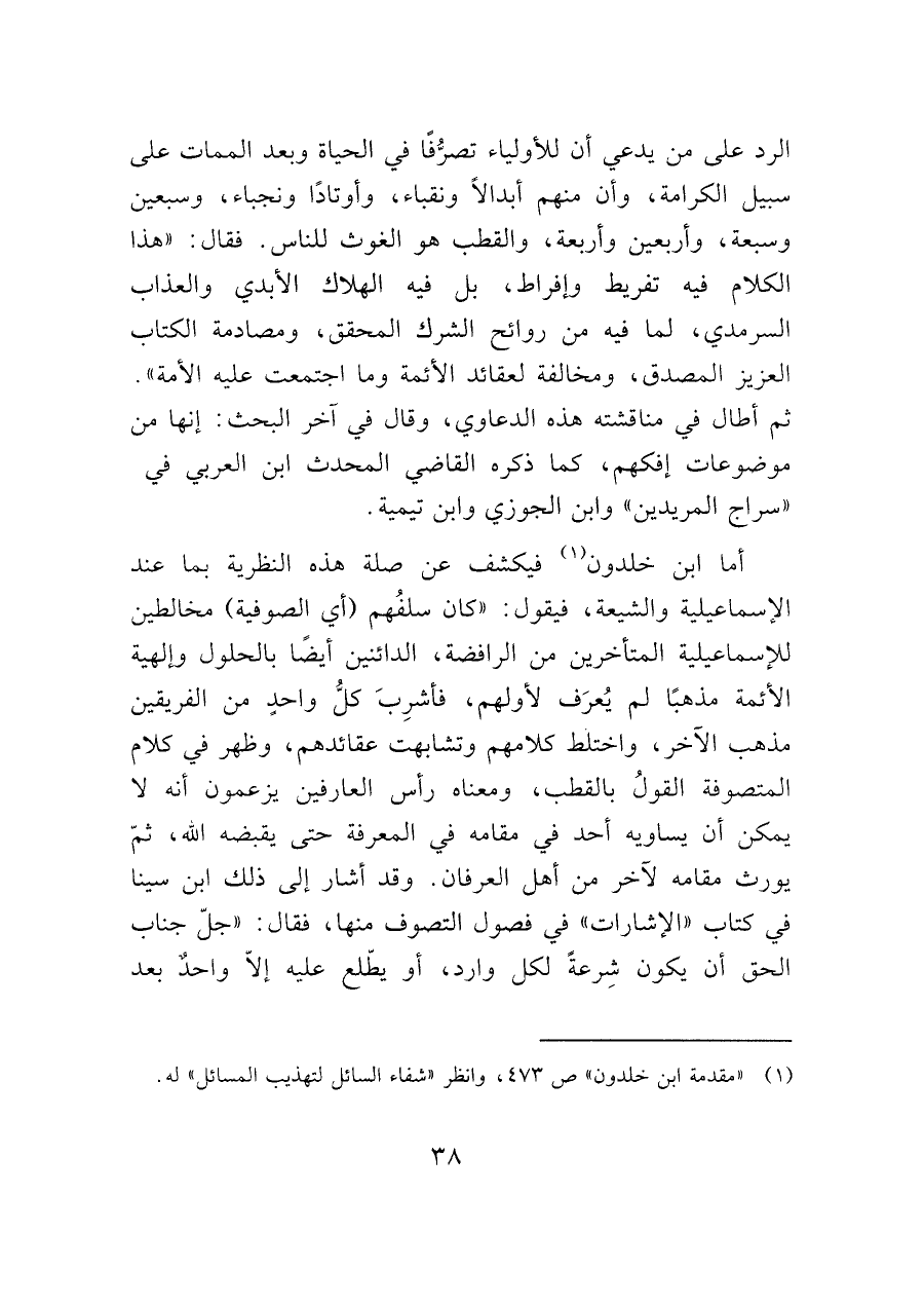 أما ابن خلدون (¬١) فيكشف عن صلة هذه النظرية بما عند الإسماعيلية والشيعة، فيقول: "كان سلفُهم (أي الصوفية) مخالطين للإسماعيلية المتأخرين من الرافضة، الدائنين أيضًا بالحلول وإلهية الأئمة مذهبًا لم يُعرَف لأولهم، فأشرِبَ كلُّ واحدٍ من الفريقين مذهب الآخر، واختلط كلامهم وتشابهت عقائدهم، وظهر في كلام المتصوفة القولُ بالقطب، ومعناه رأس العارفين يزعمون أنه لا يمكن أن يساويه أحد في مقامه في المعرفة حتى يقبضه الله، ثمّ يورث مقامه لآخر من أهل العرفان. وقد أشار إلى ذلك ابن سينا في كتاب "الإشارات" في فصول التصوف منها، فقال: "جلّ جناب الحق أن يكون شِرعةً لكل وارد، أو يطلع عليه إلاّ واحدٌ بعد