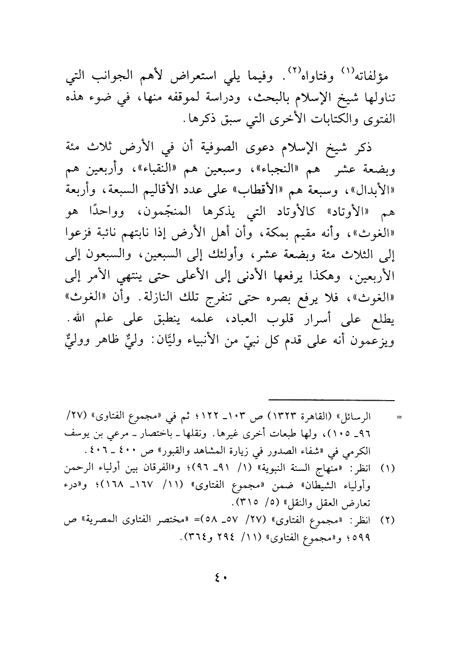 ذكر شيخ الإسلام دعوى الصوفية أن في الأرض ثلاث مائة وبضعة عشر هم "النجباء"، وسبعين هم "النقباء"، وأربعين هم "الأبدال "، وسبعة هم "الأقطاب" على عدد الأقاليم السبعة، وأربعة هم "الأوتاد" كالأوتاد التي يذكرها المنجّمون، وواحدًا هو "الغوث"، وأنه مقيم بمكة، وأن أهل الأرض إذا نابتهم نائبة فزعوا إلى الثلاث مائة وبضعة عشر، وأولئك إلى السبعين، والسبعون إلى الأربعين، وهكذا يرفعها الأدنى إلى الأعلى حتى ينتهي الأمر إلى "الغوث"، فلا يرفع بصره حتى تنفرج تلك النازلة. وأن "الغوث" يطلع على أسرار قلوب العباد، علمه ينطبق على علم الله.