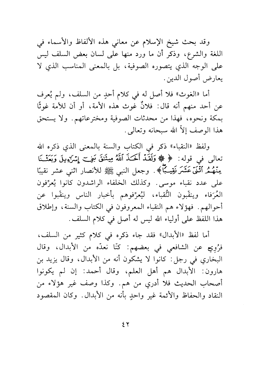 ولفظ "النقباء" ذكر في الكتاب والسنة بالمعنى الذي ذكره الله تعالى في قوله: (* وَلَقَدْ أَخَذَ اللَّهُ مِيثَاقَ بَنِي إِسْرائيلَ وَبَعَثْنَا مِنْهُمُ اثْنَيْ عَشَرَ نَقِيباً). وجعل النبي - صَلَّى اللَّهُ عَلَيْهِ وَسَلَّمَ - للأنصار اثني عشر نقيبًا على عدد نقباء موسى. وكذلك الخلفاء الراشدون كانوا يُعرِّفون العُرَفاء وينقّبون النُّقباء، ليُعرِّفوهم بأخبار الناس وينقّبوا عن أحوالهم. فهؤلاء هم النقباء المعروفون في الكتاب والسنة، وإطلاق هذا اللفظ على أولياء الله ليس له أصل في كلام السلف.