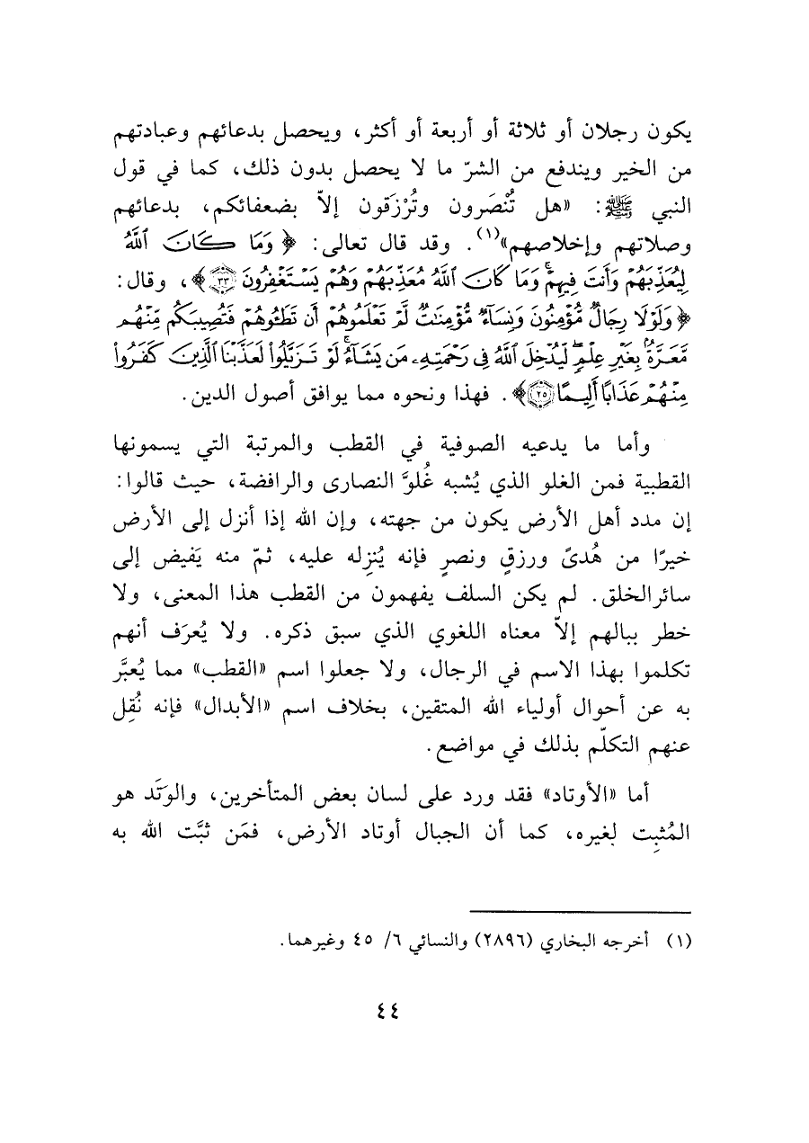 يكون رجلان أو ثلاثة أو أربعة أو أكثر، ويحصل بدعائهم وعبادتهم من الخير ويندفع من الشرّ ما لا يحصل بدون ذلك، كما في قول النبي - صَلَّى اللَّهُ عَلَيْهِ وَسَلَّمَ -: "هل تنصَرون وتُرْزَقون إلاّ بضعفائكم، بدعائهم وصلاتهم وإخلاصهم" (¬١). وقد قال تعالى: (وَمَا كَانَ اللَّهُ لِيُعَذِّبَهُمْ وَأَنْتَ فِيهِمْ وَمَا كَانَ اللَّهُ مُعَذِّبَهُمْ وَهُمْ يَسْتَغْفِرُونَ (٣٣))، وقال: (وَلَوْلا رِجَالٌ مُؤْمِنُونَ وَنِسَاءٌ مُؤْمِنَاتٌ لَمْ تَعْلَمُوهُمْ أَنْ تَطَأُوهُمْ فَتُصِيبَكُمْ مِنْهُمْ مَعَرَّةٌ بِغَيْرِ عِلْمٍ لِيُدْخِلَ اللَّهُ فِي رَحْمَتِهِ مَنْ يَشَاءُ لَوْ تَزَيَّلُوا لَعَذَّبْنَا الَّذِينَ كَفَرُوا مِنْهُمْ عَذَاباً أَلِيماً (٢٥)). فهذا ونحوه مما يوافق أصول الدين.