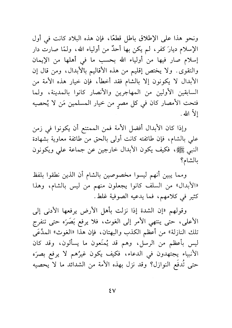 ونحو هذا على الإطلاق باطل قطعًا، فإن هذه البلاد كانت في أول الإسلام ديارَ كفر، لم يكن بها أحدٌ من أولياء الله، ولمّا صارت دار إسلام صار فيها من أولياء الله بحسب ما في أهلها من الإيمان والتقوى. ولا يختص إقليم من هذه الأقاليم بالأبدال، ومن قال إن الأبدال لا يكونون إلاّ بالشام فقد أخطأ، فإن خيار هذه الأمة من السابقين الأولين من المهاجرين والأنصار كانوا بالمدينة، ولما فتحت الأمصار كان في كل مصرِ من خيار المسلمين مَن لا يُحصيه إلاّ الله.