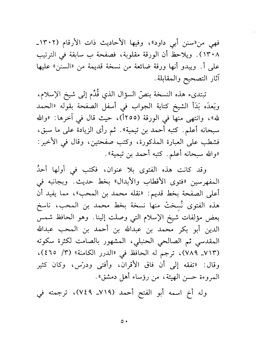 وقد كانت هذه الفتوى بلا عنوان، فكتب في أولها أحدُ المفهرسين "فتوى الأقطاب والأبدال" بخط حديث. وبجانبه في أعلى الصفحة بخط قديم: "نقله محمد بن المحب"، مما يفيد أن هذه الفتوى نُسِختْ منها نسخة بخط محمد بن المحب، ناسخ بعض مؤلفات شيخ الإسلام التي وصلت إلينا. وهو الحافظ شمس الدين أبو بكر محمد بن عبد الله بن أحمد بن المحب عبد الله المقدسي ثم الصالحي الحنبلي، المشهور بالصامت لكثرة سكوته (٧١٣ - ٧٨٩)، ترجم له الحافظ في "الدرر الكامنة" (٣/ ٤٦٥)، وقال: "تفقه إلى أن فاق الأقران، وأفتى ودرّس، وكان كثير المروءة حسن الهيئة، من رؤساء أهل دمشق".