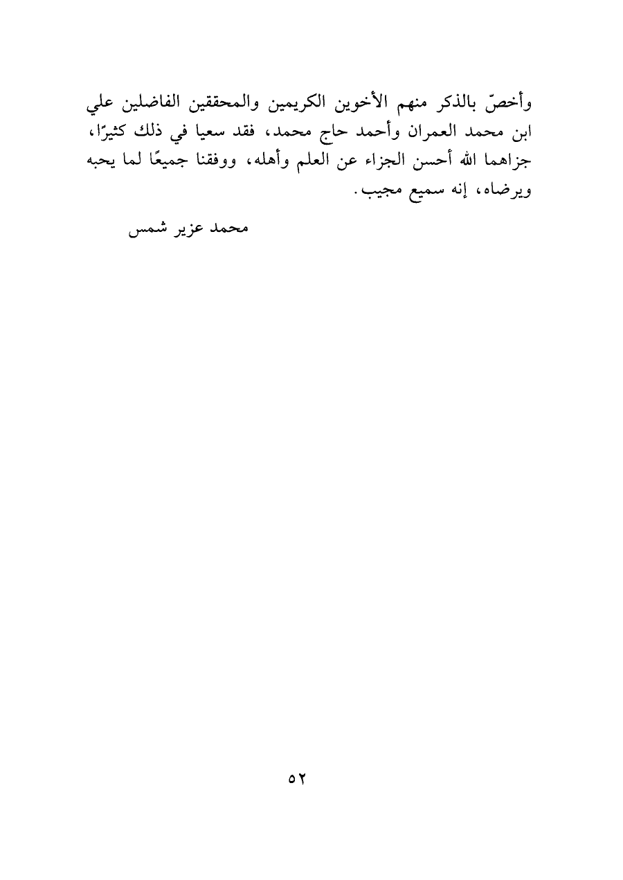 وأخصّ بالذكر منهم الأخوين الكريمين والمحققين الفاضلين علي ابن محمد العمران وأحمد حاج محمد، فقد سعيا في ذلك كثيرًا، جزاهما الله أحسن الجزاء عن العلم وأهله، ووفقنا جميعًا لما يحبه ويرضاه، إنه سميع مجيب.