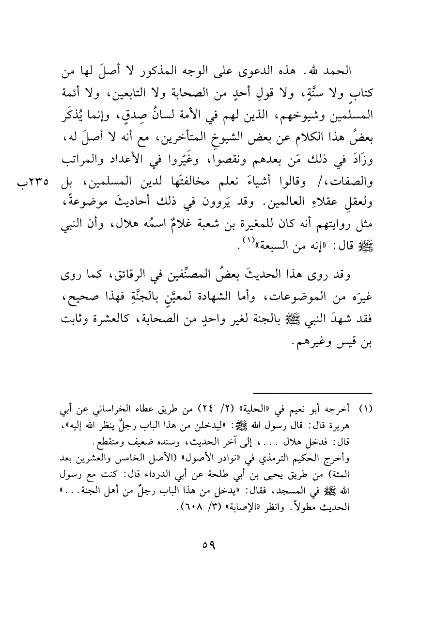 الحمد لله. هذه الدعوى على الوجه المذكور لا أصلَ لها من كتاب ولا سنَّةٍ، ولا قولِ أحدٍ من الصحابة ولا التابعين، ولا أئمة المسلمين وشيوخهم، الذين لهم في الأمة لسانُ صِدقٍ، وإنما يُذكَر بعضُ هذا الكلام عن بعض الشيوخِ المتأخرين، مع أنه لا أصلَ له، وزَادَ في ذلك مَن بعدهم ونقصوا، وغَيروا في الأعداد والمراتب والصفات،/ وقالوا أشياءَ نعلم مخالفتَها لدين المسلمين، بل ولعقلِ عقلاءِ العالمين. وقد يَروون في ذلك أحاديثَ موضوعة، مثل روايتهم أنه كان للمغيرة بن شعبة غلام اسمُه هلال، وأن النبي - صَلَّى اللَّهُ عَلَيْهِ وَسَلَّمَ - قال: "إنه من السبعة" (¬١).