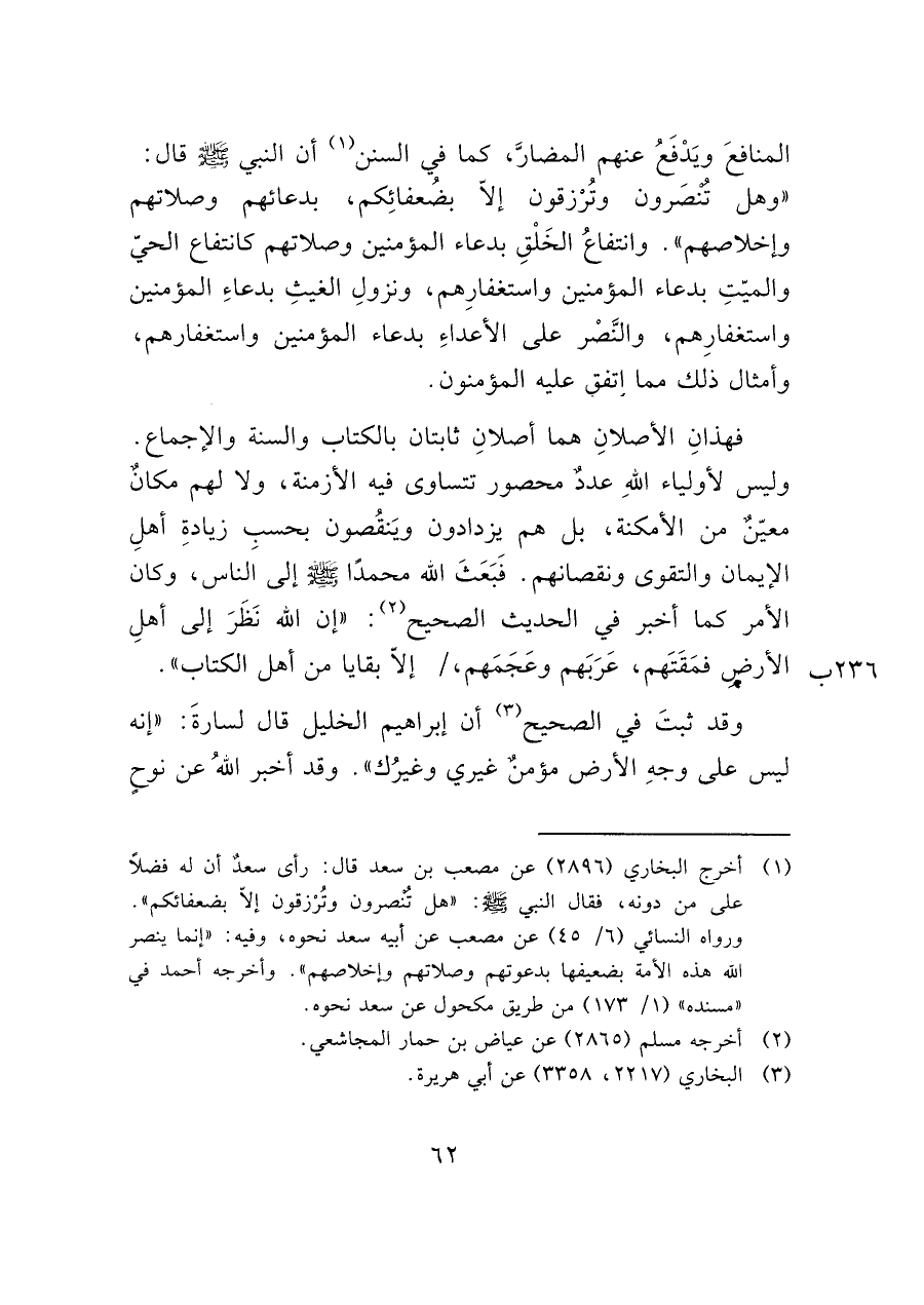 فهذانِ الأصلانِ هما أصلانِ ثابتان بالكتاب والسنة والإجماع. وليس لأولياء الله عددٌ محصور تتساوى فيه الأزمنة، ولا لهم مكانٌ معيّنٌ من الأمكنة، بل هم يزدادون ويَنقُصون بحسبِ زيادةِ أهلِ الإيمان والتقوى ونقصانهم. فَبَعَثَ الله محمدًا - صَلَّى اللَّهُ عَلَيْهِ وَسَلَّمَ - إلى الناس، وكان الأمر كما أخبر في الحديث الصحيح (¬٢): "إن الله نَظَرَ إلى أهلِ ٢٣٦ ب الأرض فمَقَتَهم، عَرَبَهم وعَجَمَهم،/ إلاّ بقايا من أهل الكتاب".