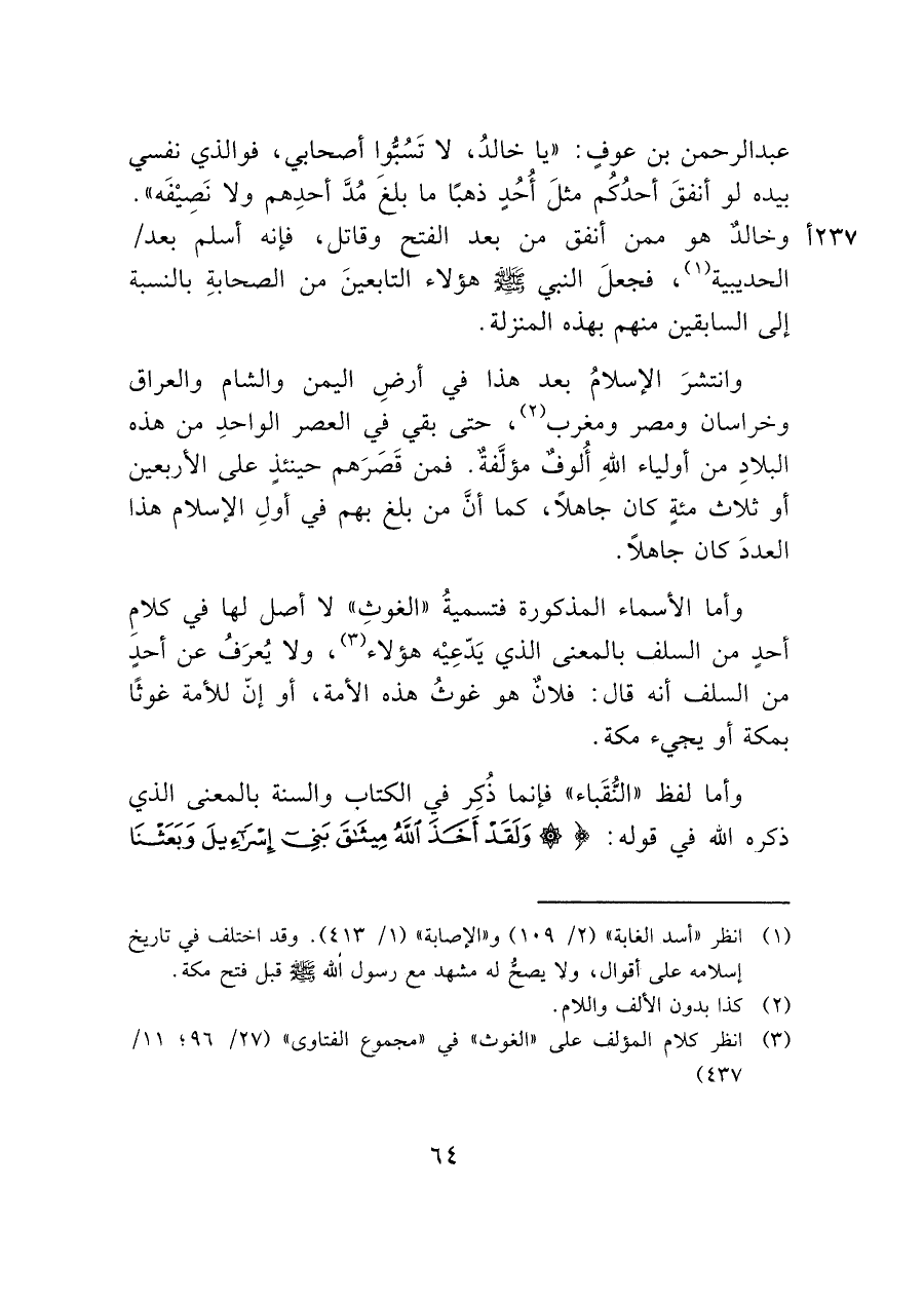 عبد الرحمن بن عوفٍ: "يا خالدُ، لا تَسُبُّوا أصحابي، فوالذي نفسي بيده لو أنفقَ أحدُكُم مثلَ أُحُدٍ ذهبًا ما بلغَ مُذَ أحدِهم ولا نَصِيْفَه ". وخالدٌ هو ممن أنفق من بعد الفتح وقاتل، فإنه أسلم بعد/ الحديبية (¬١)، فجعلَ النبي - صَلَّى اللَّهُ عَلَيْهِ وَسَلَّمَ - هؤلاء التابعينَ من الصحابةِ بالنسبة إلى السابقين منهم بهذه المنزلة.