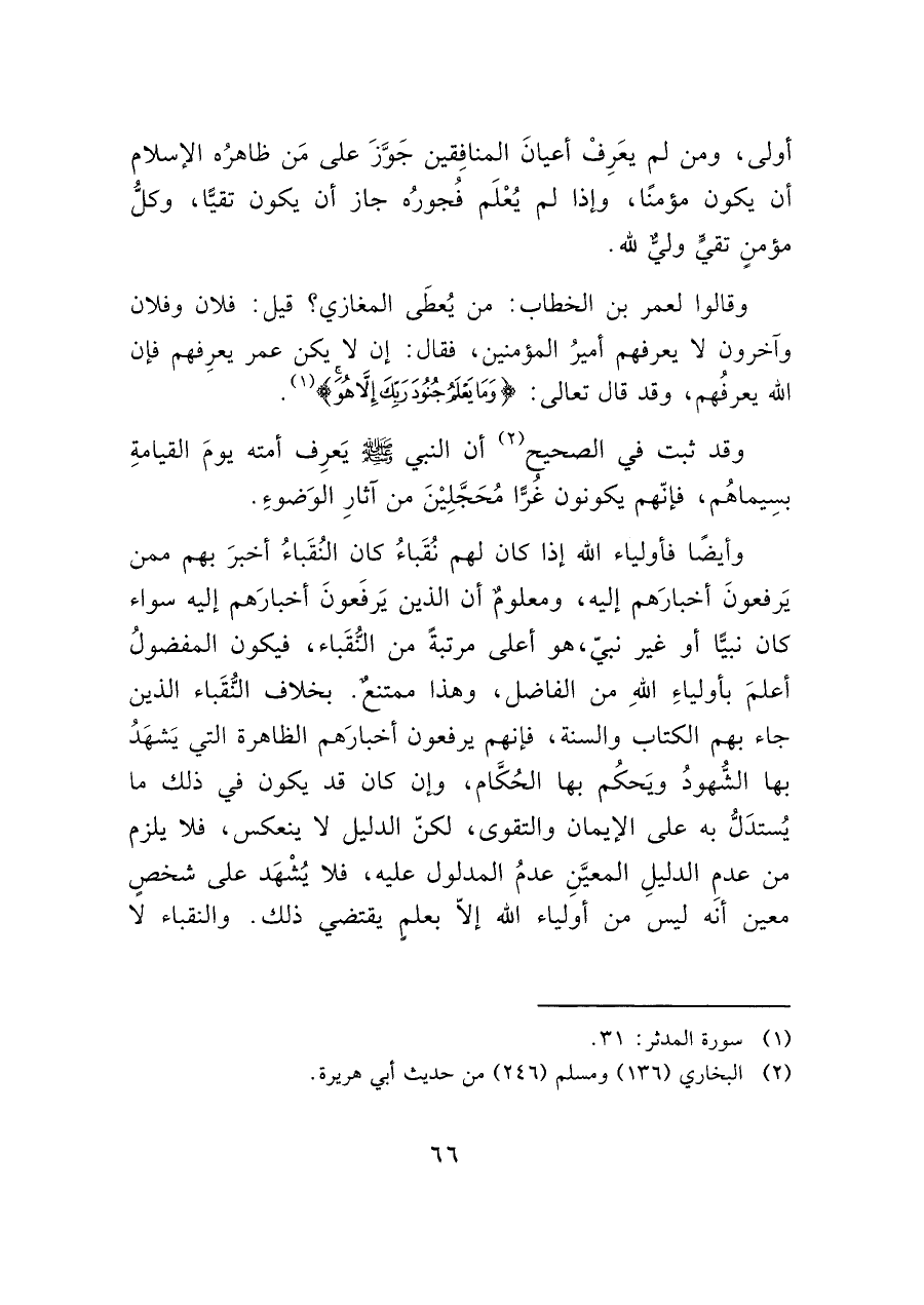 وأيضًا فأولياء الله إذا كان لهم نُقَباءُ كان النُقَباءُ أخبرَ بهم ممن يَرفعونَ أخبارَهم إليه، ومعلومٌ أن الذين يَرفَعونَ أخبارَهم إليه سواء كان نبيًّا أو غير نبيّ، هو أعلى مرتبةً من النُّقَباء، فيكون المفضولُ أعلمَ بأولياءِ اللهِ من الفاضل، وهذا ممتنعٌ. بخلاف النُّقَباء الذين جاء بهم الكتاب والسنة، فإنهم يرفعون أخبارَهم الظاهرة التي يَشهَدُ بها الشُّهودُ ويَحكُم بها الحُكَّام، وإن كان قد يكون في ذلك ما يُستدَلُّ به على الإيمان والتقوى، لكنّ الدليل لا ينعكس، فلا يلزم من عدمِ الدليلِ المعيَّنِ عدمُ المدلول عليه، فلا يُشْهَد على شخصٍ معين أنه ليس من أولياء الله إلاّ بعليم يقتضي ذلك. والنقباء لا