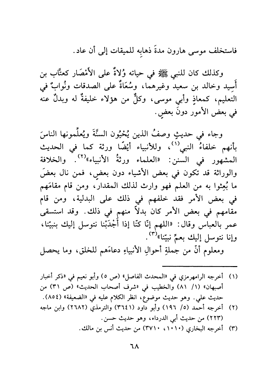 وجاء في حديثٍ وصفُ الذين يُحيون السنَّةَ ويُعلِّمونها الناسَ بأنهم خلفاءُ النبي (¬١)، وللأنبياء أيضًا ورثة كما في الحديث المشهور في السنن: "العلماء ورثةُ الأنبياء" (¬٢). والخلافة والوراثة قد تكون في بعض الأشياء دون بعض، فمن نال بعضَ ما بُعِثوا به من العلم فهو وارث لذلك المقدار، ومن قام مقامَهم في بعض الأمر فقد خلفهم في ذلك على البدلية، ومن قام مقامهم في بعض الأمر كان بدلاً منهمِ في ذلك. وقد استسقى عمر بالعباس وقال: "اللهم إنّا كنّا إذا أجْدَبْنا نتوسل إليك بنبيّنا، وإنا نتوسل إليك بعمِّ نبيّنا" (¬٣).