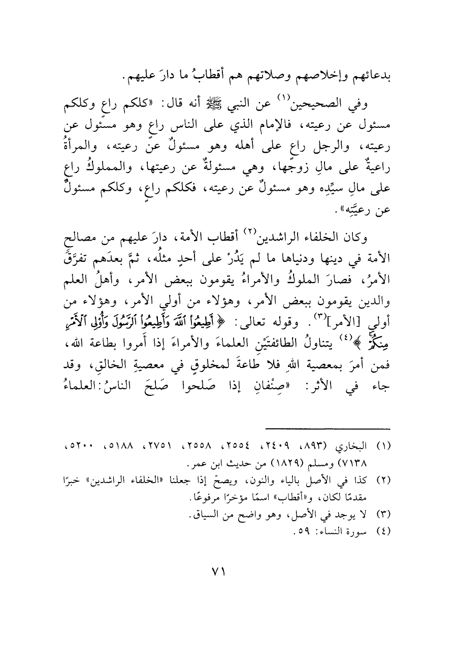 وكان الخلفاء الراشدين (¬٢) أقطاب الأمة، دارَ عليهم من مصالحِ الأمة في دينها ودنياها ما لم يَدُرْ على أحدٍ مثلُه، ثمَّ بعدَهم تفرَّقَ الأمرُ، فصارَ الملوكُ والأمراءُ يقومون ببعض الأمر، وأهلُ العلم والدين يقومون ببعض الأمر، وهؤلاء من أولي الأمر، وهؤلاء من أولى [الأمر] (¬٣). وقوله تعالى: (أَطِيعُوا اللَّهَ وَأَطِيعُوا الرَّسُولَ وَأُولِي الْأَمْرِ مِنْكُمْ) (¬٤) يتناولُ الطائفتَيْنِ العلماءَ والأمراءَ إذا أَمروا بطاعة الله، فمن أمرَ بمعصية الله فلا طاعةَ لمخلوقٍ في معصيةِ الخالقِ، وقد جاء في الأثر: "صِنْفانِ إذا صَلحوا صَلحَ الناسُ: العلماءُ