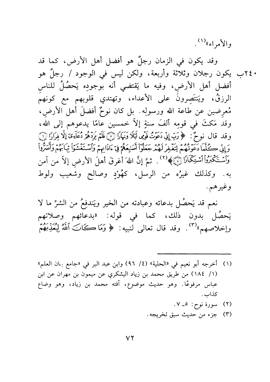 وقد يكون في الزمان رجلٌ هو أفضل أهل الأرض، كما قد يكون رجلان وثلاثة وأربعة، ولكن ليس في الوجود/رجلٌ هو أفضل أهل الأرضِ، وفيه ما يَقتضي أنه بوجودِه يَحصُلُ للناسِ الرزقُ، ويَنتَصِرونَ على الأعداء، وتهتدي قلوبهم مع كونهم مُعرِضين عن طاعة الله ورسوله. بل كان نوح أفضلَ أهل الأرضِ، وقد مَكثَ في قومِه ألفَ سنةٍ إلاّ خمسين عامًا يدعوهم إلى الله، وقد قال نوح: (رَبِّ إِنِّي دَعَوْتُ قَوْمِي لَيْلًا وَنَهَارًا (٥) فَلَمْ يَزِدْهُمْ دُعَائِي إِلَّا فِرَارًا (٦) وَإِنِّي كُلَّمَا دَعَوْتُهُمْ لِتَغْفِرَ لَهُمْ جَعَلُوا أَصَابِعَهُمْ فِي آَذَانِهِمْ وَاسْتَغْشَوْا ثِيَابَهُمْ وَأَصَرُّوا وَاسْتَكْبَرُوا اسْتِكْبَارًا (٧)) (¬٢). لمَّ إنَّ اللهَ أغرقَ أهلَ الأرضِ إلاّ من آمن به. وكذلك غيرُه من الرسل، كهُوْدٍ وصالح وشعيب ولوط وغيرهم.