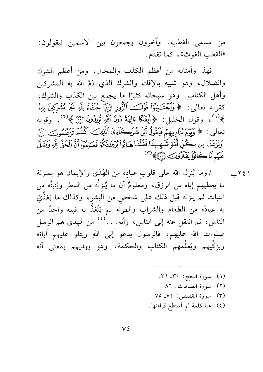 فهذا وأمثاله من أعظم الكذب والمحال، ومن أعظم الشرك والضلال، وهو شبيه بالإفك والشرك الذي ذمَّ الله به المشركين وأهل الكتاب. وهو سبحانه كثيرًا ما يجمع بين الكذب والشرك، كقوله تعالى: (وَاجْتَنِبُوا قَوْلَ الزُّورِ (٣٠) حُنَفَاءَ لِلَّهِ غَيْرَ مُشْرِكِينَ بِهِ) (¬١)، وقول الخليل: (أَئِفْكًا آَلِهَةً دُونَ اللَّهِ تُرِيدُونَ) (٨٦) (¬٢)، وفي له تعالى:) (وَيَوْمَ يُنَادِيهِمْ فَيَقُولُ أَيْنَ شُرَكَائِيَ الَّذِينَ كُنْتُمْ تَزْعُمُونَ (٧٤) وَنَزَعْنَا مِنْ كُلِّ أُمَّةٍ شَهِيدًا فَقُلْنَا هَاتُوا بُرْهَانَكُمْ فَعَلِمُوا أَنَّ الْحَقَّ لِلَّهِ وَضَلَّ عَنْهُمْ مَا كَانُوا يَفْتَرُونَ (٧٥)) (¬٣).