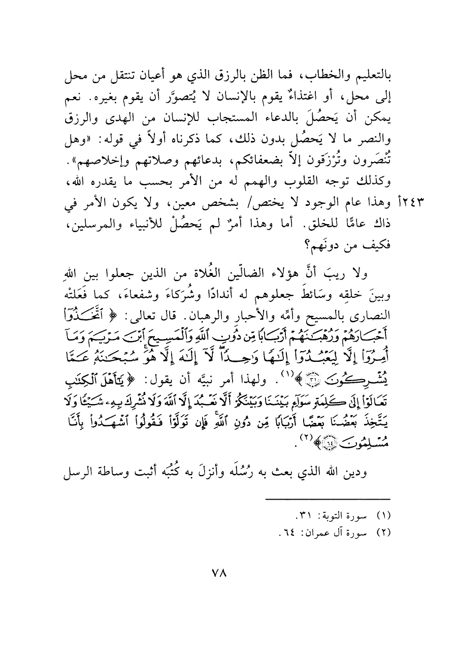 ولا ريبَ أنَ هؤلاء الضالّين الغُلاة من الذين جعلوا بين اللهِ وبينَ خلقِه وسَائطَ جعلوهم له أندادًا وشُرَكاءَ وشفعاءَ، كما فَعَلتْه النصارى بالمسيح وأمِّه والأحبارِ والرهبان. قال تعالى: (اتَّخَذُوا أَحْبَارَهُمْ وَرُهْبَانَهُمْ أَرْبَابًا مِنْ دُونِ اللَّهِ وَالْمَسِيحَ ابْنَ مَرْيَمَ وَمَا أُمِرُوا إِلَّا لِيَعْبُدُوا إِلَهًا وَاحِدًا لَا إِلَهَ إِلَّا هُوَ سُبْحَانَهُ عَمَّا يُشْرِكُونَ (٣١)) (¬١). ولهذا أمر نبيَّه أن يقول: (يَا أَهْلَ الْكِتَابِ تَعَالَوْا إِلَى كَلِمَةٍ سَوَاءٍ بَيْنَنَا وَبَيْنَكُمْ أَلَّا نَعْبُدَ إِلَّا اللَّهَ وَلَا نُشْرِكَ بِهِ شَيْئًا وَلَا يَتَّخِذَ بَعْضُنَا بَعْضًا أَرْبَابًا مِنْ دُونِ اللَّهِ فَإِنْ تَوَلَّوْا فَقُولُوا اشْهَدُوا بِأَنَّا مُسْلِمُونَ (٦٤)) (¬٢).