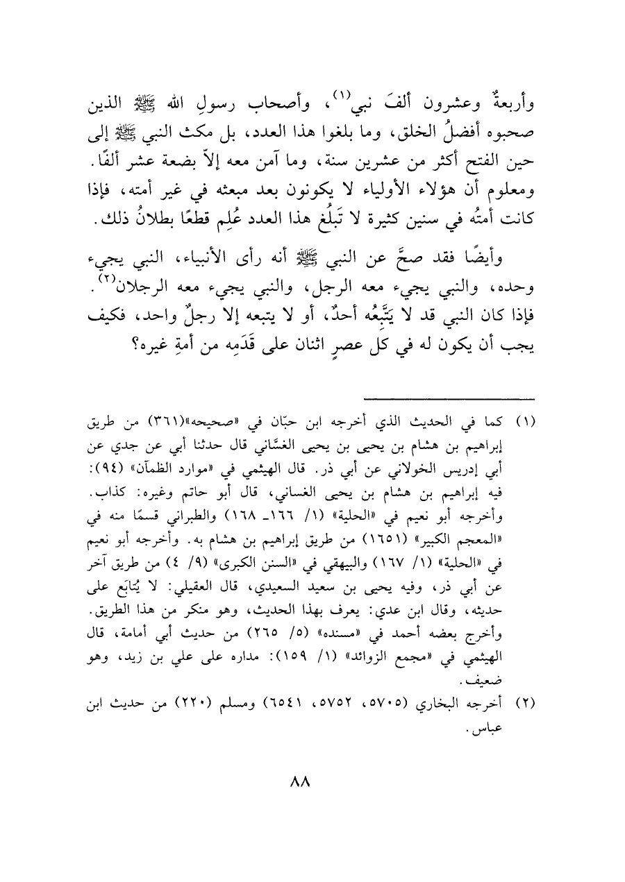 فإذا كان النبي قد لا يَتَبعُه أحدٌ، أو لا يتبعه إلاّ رجلٌ واحد، فكيف يجب أن يكون له في كَل عصرٍ اثنان على قَدَمِه من أمةِ غيره؟