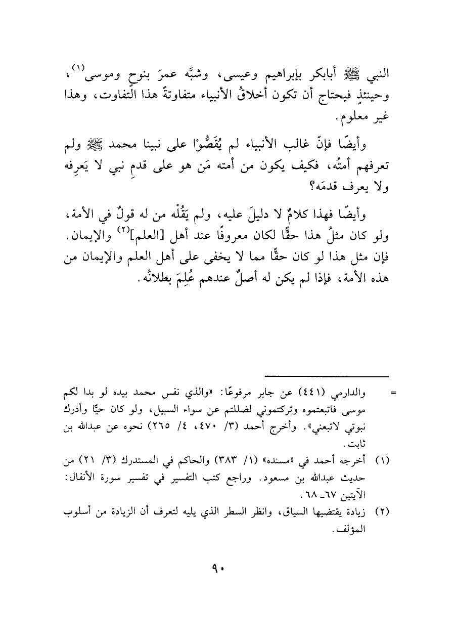 وأيضا فإنّ غالب الأنبياء لم يُقَصُّوْا على نبينا محمد - صَلَّى اللَّهُ عَلَيْهِ وَسَلَّمَ - ولم تعرفهم أمتُه، فكيف يكون من أمته مَن هو على قدمِ نبي لا يَعرِفه ولا يعرف قدمَه؟