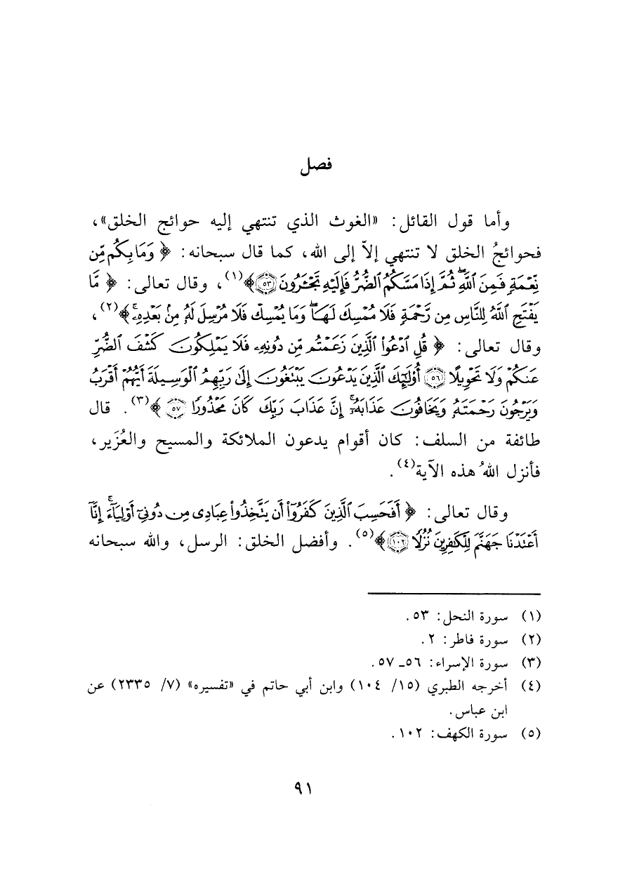 وأما قول القائل: "الغوث الذي تنتهي إليه حوائج الخلق"، فحوائجُ الحلق لا تنتهي إلاّ إلى الله، كما قال سبحانه: (وَمَا بِكُم فِن نِعمَهِ فَمِنَ اَللهِ ثُمَّ إِذَا مَسَّكمُ اَلضُّرُ فَإِلَيْهِ تَجْأَرُونَ (٥٣)) (¬١)، وقال تعالى: (مَا يَفْتَحِ اللَّهُ لِلنَّاسِ مِنْ رَحْمَةٍ فَلا مُمْسِكَ لَهَا وَمَا يُمْسِكْ فَلا مُرْسِلَ لَهُ مِنْ بَعْدِهِ) (¬٢)، وقال تعالى: (قُلِ ادْعُوا الَّذِينَ زَعَمْتُمْ مِنْ دُونِهِ فَلا يَمْلِكُونَ كَشْفَ الضُّرِّ عَنْكُمْ وَلا تَحْوِيلاً (٥٦) أُولَئِكَ الَّذِينَ يَدْعُونَ يَبْتَغُونَ إِلَى رَبِّهِمُ الْوَسِيلَةَ أَيُّهُمْ أَقْرَبُ وَيَرْجُونَ رَحْمَتَهُ وَيَخَافُونَ عَذَابَهُ إِنَّ عَذَابَ رَبِّكَ كَانَ مَحْذُوراً (٥٧)) (¬٣). قال طائفة من السلف: كان أقوام يدعون الملائكة والمسيح والعُزَير، فأنزل الله هذه الآية (¬٤).