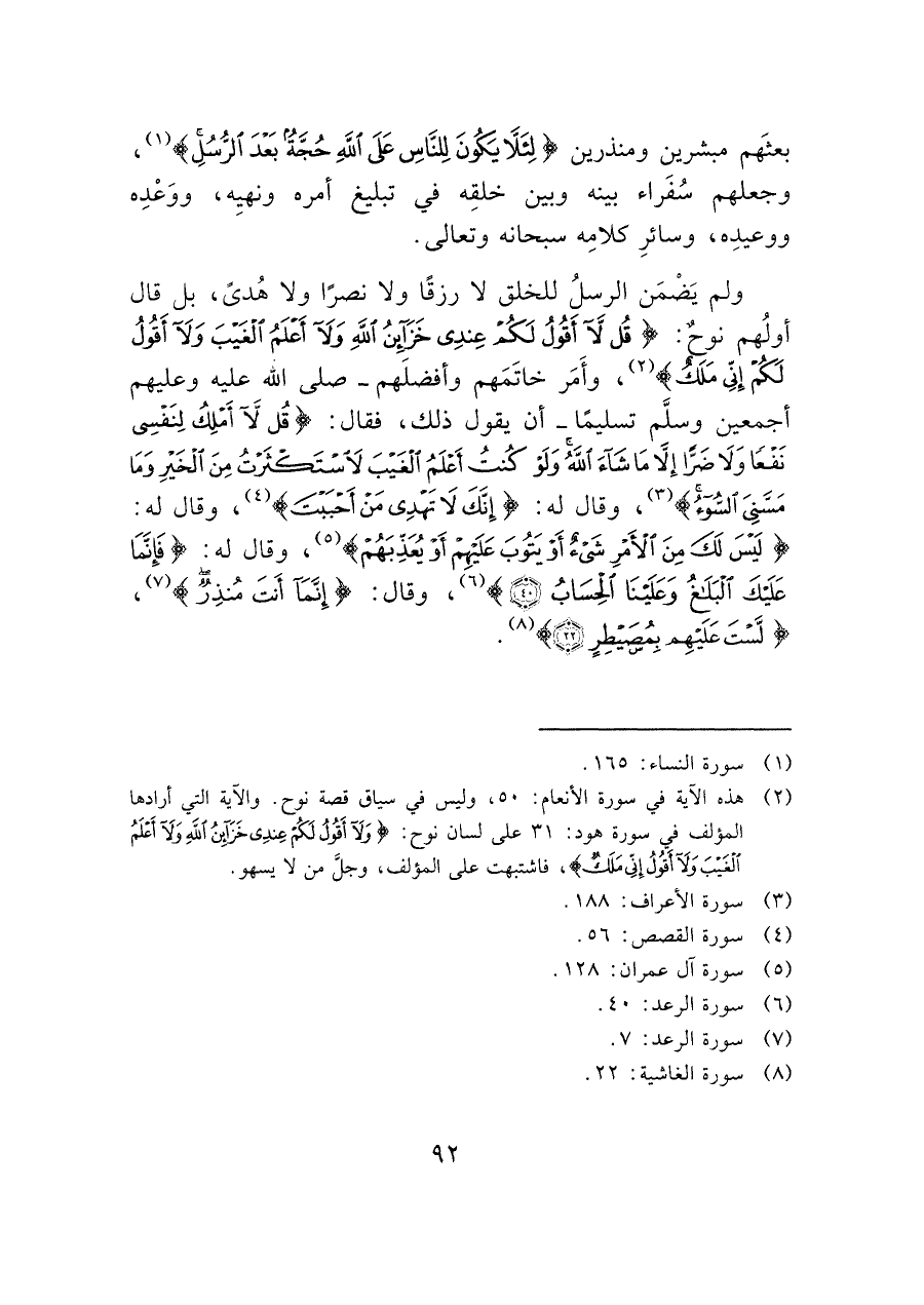 ولم يَضْمَن الرسلُ للخلق لا رزقًا ولا نصرًا ولا هُدىً، بل قال أولُهم نوحٌ: (قُلْ لَا أَقُولُ لَكُمْ عِنْدِي خَزَائِنُ اللَّهِ وَلَا أَعْلَمُ الْغَيْبَ وَلَا أَقُولُ لَكُمْ إِنِّي مَلَك) (¬٢)، وأَمَر خاتَمَهم وأفضلَهم- صلى الله عليه وعليهم أجمعين وسلَّم تسليمًا -أن يقول ذلك، فقال: (قُلْ لَا أَمْلِكُ لِنَفْسِي نَفْعًا وَلَا ضَرًّا إِلَّا مَا شَاءَ اللَّهُ وَلَوْ كُنْتُ أَعْلَمُ الْغَيْبَ لَاسْتَكْثَرْتُ مِنَ الْخَيْرِ وَمَا مَسَّنِيَ السُّوء) (¬٣)، وقال له: (إِنَّكَ لَا تهدِى مَن أَحببتَ) (¬٤)، وقال له: (لَيْسَ لَكَ مِنَ الْأَمْرِ شَيْءٌ أَوْ يَتُوبَ عَلَيْهِمْ أَوْ يُعَذِّبَهُمْ) (¬٥)، وقال له: (فَإِنَّمَا عَلَيْكَ الْبَلَاغُ وَعَلَيْنَا الْحِسَابُ (٤٠)) (¬٦)، وقال: (إنما أنت منذرٌ) (¬٧)، (لست عليهم بمصيطرٍ) (¬٨).