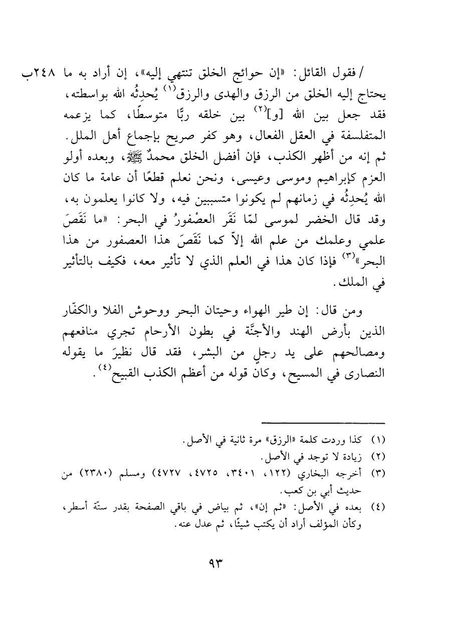 ومن قال: إن طير الهواء وحيتان البحر ووحوش الفلا والكفّار الذين بأرض الهند والأجنَّة في بطون الأرحام تجري منافعهم ومصالحهم على يد رجلٍ من البشر، فقد قال نظيرَ ما يقوله النصارى في المسيح، وكان قوله من أعظم الكذب القبيح (¬٤).