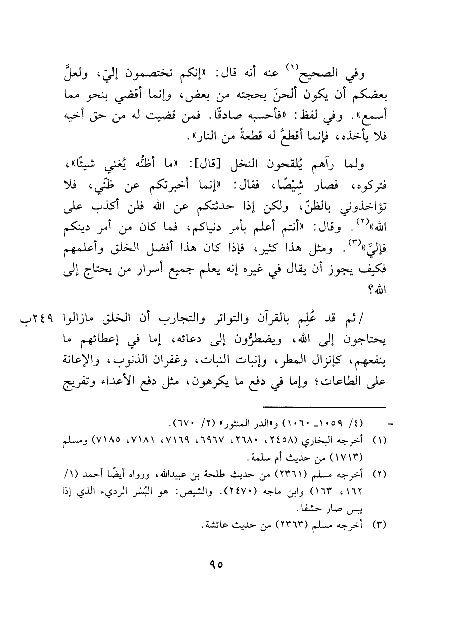 ولما رآهم يُلقحون النخل [قال]: "ما أظنُّه يُغني شيئًا"، فتركوه، فصار شِيْصًا، فقال: "إنما أخبرتكم عن ظنّي، فلا تؤاخذوني بالظنّ، ولكن إذا حدثتكم عن الله فلق أكذب على الله" (¬٢). وقال: (أنتم أعلم بأمر دنياكم، فما كان من أمر دينكم فإليَّ " (¬٣). ومثل هذا كثير، فإذا كان هذا أفضل الخلق وأعلمهم فكيف يجوز أن يقال في غيره إنه يعلم جميع أسرار من يحتاج إلى الله؟