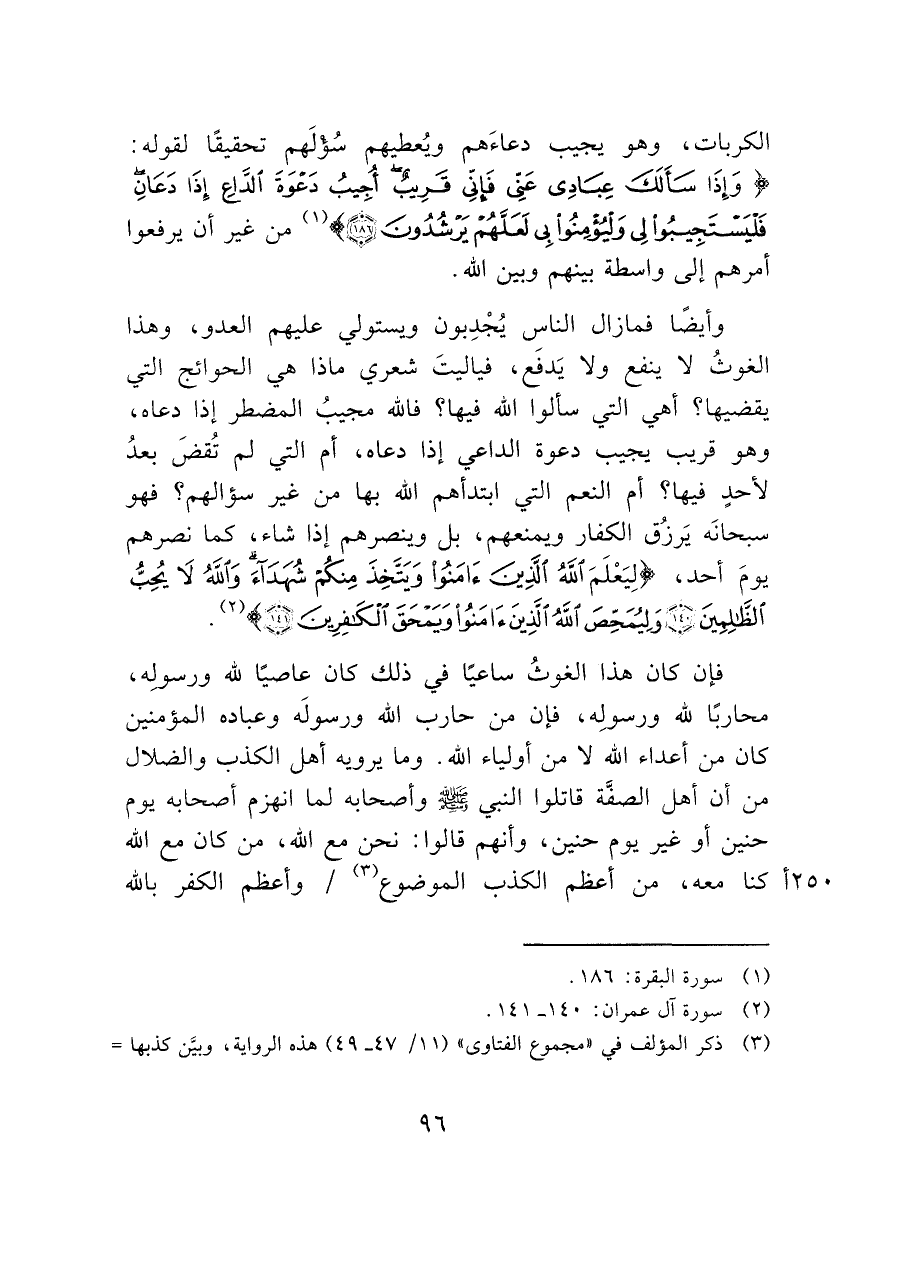 وأيضًا فمازال الناسِ يُجْدِبون ويستولي عليهم العدو، وهذا الغوثُ لا ينفع ولا يَدفع، فيا ليتَ شعري ماذا هي الحوائج التي يقضيها؟ أهي التي سألوا الله فيها؟ فالله مجيبُ المضطر إذا دعاه، وهو قريب يجيب دعوة الداعي إذا دعاه، أم التي لم تُقضَ بعدُ لأحدٍ فيها؟ أم النعم التي ابتدأهم الله بها من غير سؤالهم؟ فهو سبحانَه يَرزُق الكفار ويمنعهم، بل وينصرهم إذا شاء، كما نصرهم يومَ احد، (لِيَعْلَمَ اللَّهُ الَّذِينَ آَمَنُوا وَيَتَّخِذَ مِنْكُمْ شُهَدَاءَ وَاللَّهُ لَا يُحِبُّ الظَّالِمِين (١٤٠) وَلِيُمَحِّصَ اللَّهُ الَّذِينَ آَمَنُوا وَيَمْحَقَ الْكَافِرِينَ (١٤١)) (¬٢).