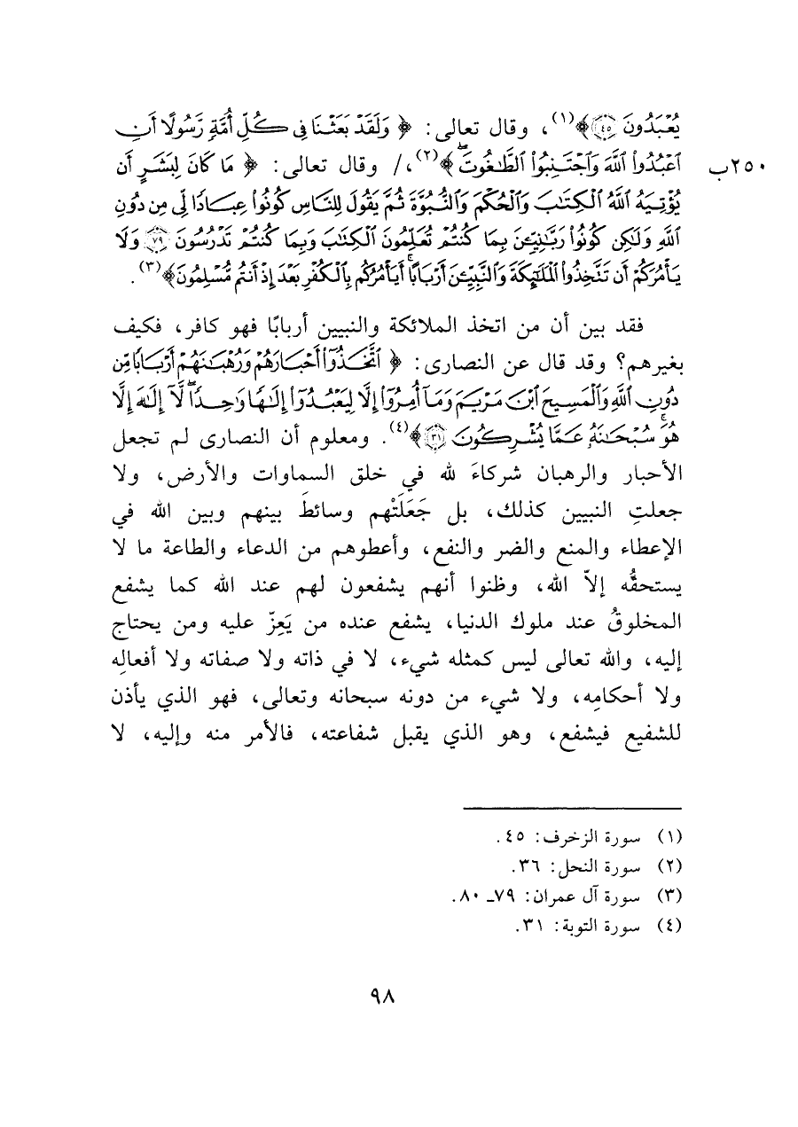فقد بين أن من اتخذ الملائكة والنبيين أربابًا فهو كافر، فكيف بغيرهم؟ وقد قال عن النصارى: (اتَّخَذُوا أَحْبَارَهُمْ وَرُهْبَانَهُمْ أَرْبَابًا مِنْ دُونِ اللَّهِ وَالْمَسِيحَ ابْنَ مَرْيَمَ وَمَا أُمِرُوا إِلَّا لِيَعْبُدُوا إِلَهًا وَاحِدًا لَا إِلَهَ إِلَّا هُوَ سُبْحَانَهُ عَمَّا يُشْرِكُون (٣١) (¬٤). ومعلوم أن النصارى لم تجعل الأحبار والرهبان شركاءَ لله في خلق السماوات والأرض، ولا جعلتِ النبيين كذلك، بل جَعَلَتْهم وسائطَ بينهم وبين الله في الإعطاء والمنع والضر والنفع، وأعطوهم من الدعاء والطاعة ما لا يستحقه إلاّ الله، وظنوا أنهم يشفعون لهم عند الله كما يشفع المخلوقُ عند ملوك الدنيا، يشفع عنده من يَعِزّ عليه ومن يحتاج إليه، والله تعالى ليس كمثله شيء، لا في ذاته ولا صفاته ولا أفعالِه ولا أحكامِه، ولا شيء من دونه سبحانه وتعالى، فهو الذي يأذن للشفيع فيشفع، وهو الذي يقبل شفاعته، فالأمر منه وإليه، لا