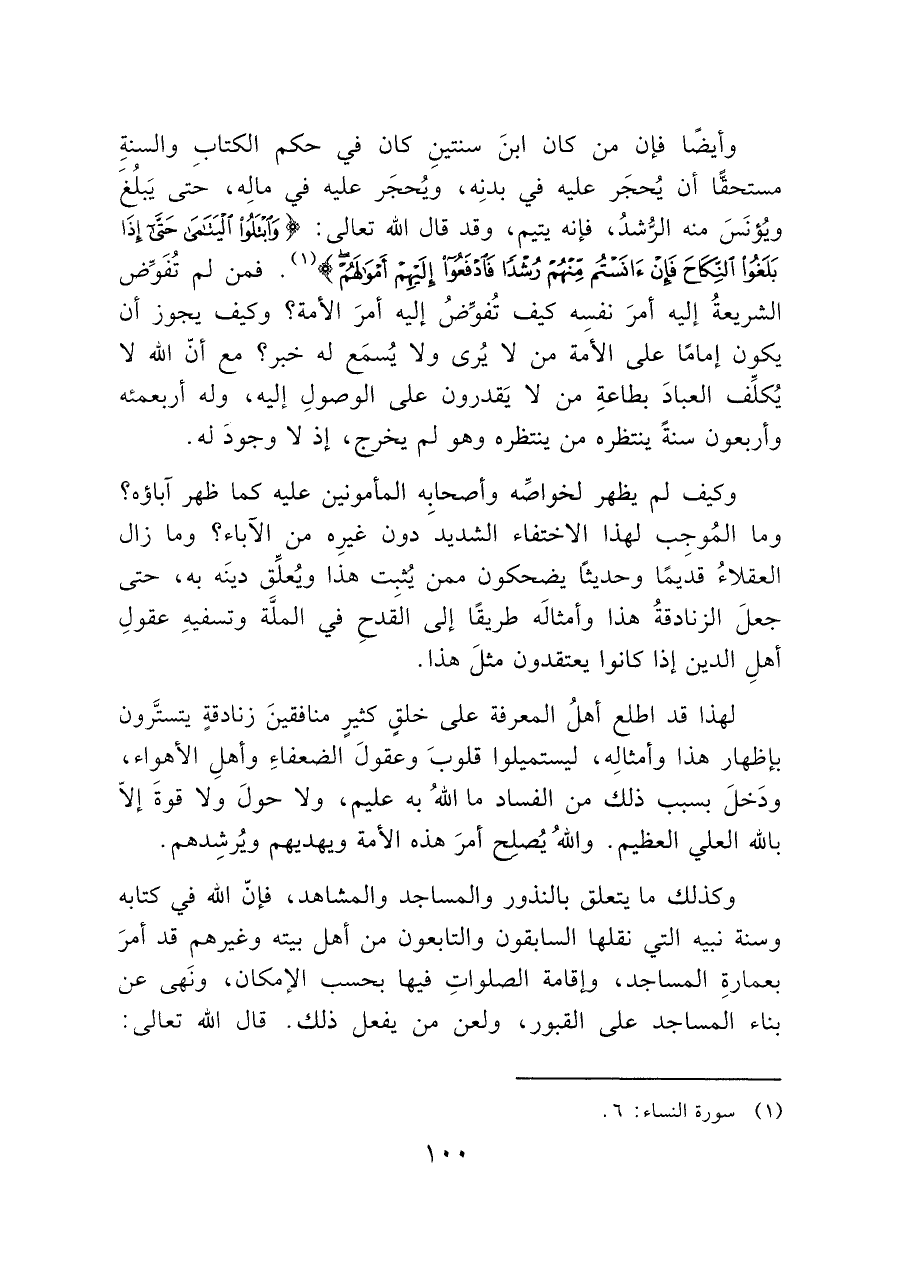 وأيضًا فإن من كان ابنَ سنتينِ كان في حكم الكتابِ والسنةِ مستحقًا أن يُحجَر عليه في بدنِه، ويُحجَر عليه في مالِه، حتى يَبلُغَ ويُؤنَسَ منه الرُّشدُ، فإنه يتيم، وقد قال الله تعالى: (وَابْتَلُوا الْيَتَامَى حَتَّى إِذَا بَلَغُوا النِّكَاحَ فَإِنْ آنَسْتُمْ مِنْهُمْ رُشْدًا فَادْفَعُوا إِلَيْهِمْ أَمْوَالَهُمْ) (¬١). فمن لم تُفَوِّض الشريعةُ إليه أمرَ نفسه كيف تُفوِّضُ إليه أمرَ الأمة؟ وكيف يجوز أن يكون إمامًا على الأمَة من لا يُرى ولا يُسمَع له خبر؟ مع أنّ الله لا يُكلِّف العبادَ بطاعةِ من لا يَقدرون على الوصولِ إليه، وله أربعمئه وأربعون سنةً ينتظره من ينتظره وهو لم يخرج، إذ لا وجودَ له.