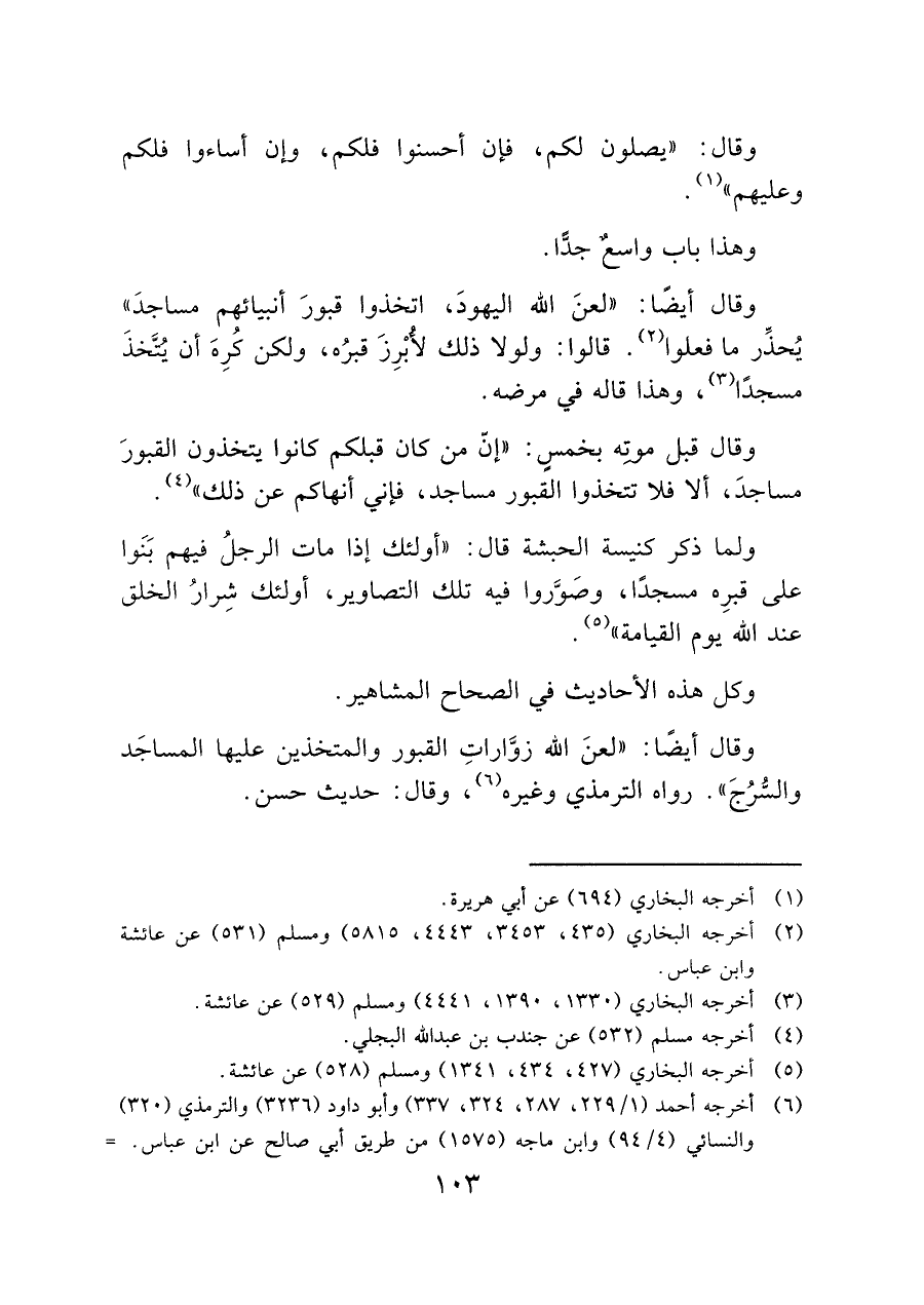 ولما ذكر كنيسة الحبشة قال: "أولئك إذا مات الرجلُ فيهم بَنَوا على قبرِه مسجدًا، وصَوَّروا فيه تلك التصاوير، أولئك شِرارُ الخلق عند الله يوم القيامة" (¬٥).