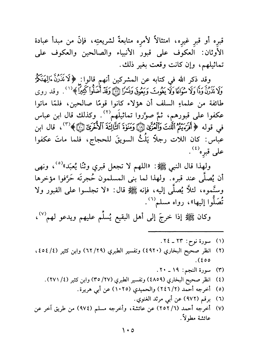 وقد ذكر الله في كتابه عن المشركين أنهم قالوا (لا تَذَرُنَّ آلِهَتَكُمْ وَلا تَذَرُنَّ وَدًّا وَلا سُوَاعًا وَلا يَغُوثَ وَيَعُوقَ وَنَسْرًا (٢٣ وَقَدْ أَضَلُّوا كَثِيرًا)) (¬١). وقد روى طائفة من علماءِ السلف أن هؤلاء كانوا قومًا صالحين، فلمّا ماتوا عكفوا على قبورهم، ثمَّ صوَّروا تماثيلَهم (¬٢). وكذلك قال ابن عباس في قوله (أَفَرَأَيْتُمُ اللَّاتَ وَالْعُزَّى (١٩) وَمَنَاةَ الثَّالِثَةَ الْأُخْرَى (٢٠)) (¬٣)، قال ابن عباس: كان اللات رجلًا يَلُتُّ السويقَ للحجاج، فلما ماتَ عكفوا على قبرِه (¬٤).