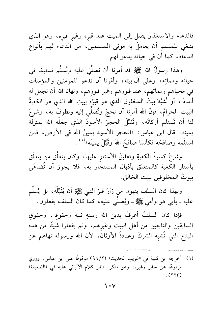 وهذا رسولُ الله - صَلَّى اللَّهُ عَلَيْهِ وَسَلَّمَ - قد أمرنا أن نصلِّيَ عليه ونُسلِّم تسليمًا في حياتِه ومماتِه، وعلى آل بيتِه، وأمَرنا أن ندعو للمؤمنين والمؤمنات في محياهم ومماتهم، عند قبورهم وغير قبورِهم، ونهانا الله أن نجعل له أندادًا، أو نُشبِّه بيتَ المخلوق الذي هو قبرُه ببيتِ الله الذي هو الكعبةُ البيت الحرامُ، فإنّ الله أمرنا أن نحجّ ونُصلّي إليه ونطوفَ به، وشرعَ لنا أن نَستلم أركانَه، ونُقبِّلَ الحجرَ الأسودَ الذي جعلَه الله بمنزلة يمينه. قال ابن عباس: "الحجر الأسود يمينُ الله في الأرض، فمن استلَمه وصافحَه فكأنما صافحَ الله وقَبَّلَ يمينَه" (¬١).