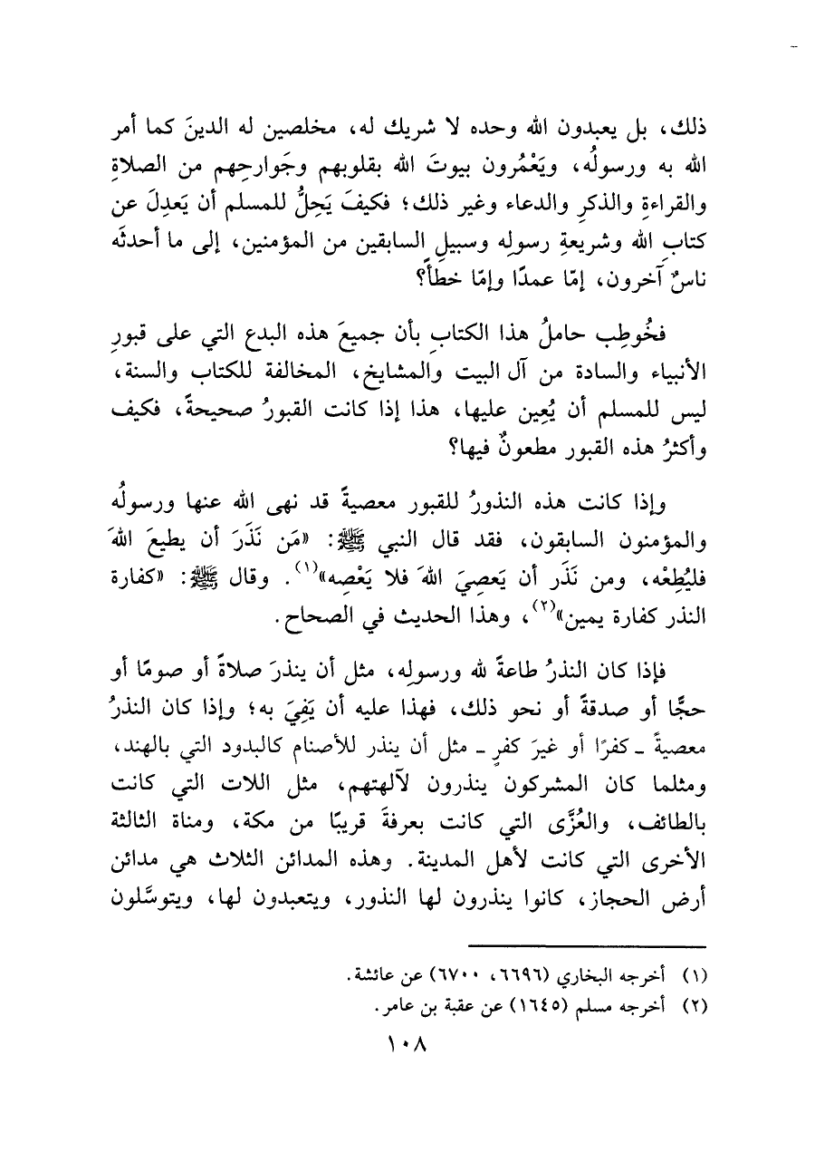 فإذا كان النذرُ طاعةً لله ورسوله، مثل أن ينذرَ صلاةً أو صومًا أو حجًّا أو صدقةً أو نحو ذلك، فهذا عليه أن يَفِيَ به؟ وإذا كان النذرُ معصيةً -كفرًا أو غيرَ كفرٍ- مثل أن ينذر للأصنام كالنذور التي بالهند، ومثلما كان المشركون ينذرون لآلهتهم، مثل اللات التي كانت بالطائف، والعُزَّى التي كانت بعرفةَ قريبًا من مكة، ومناة الثالثة الأخرى التي كانت لأهل المدينة. وهذه المدائن الثلاث هي مدائن أرض الحجاز، كانوا ينذرون لها النذور، ويتعبدون لها، ويتوسَّلون