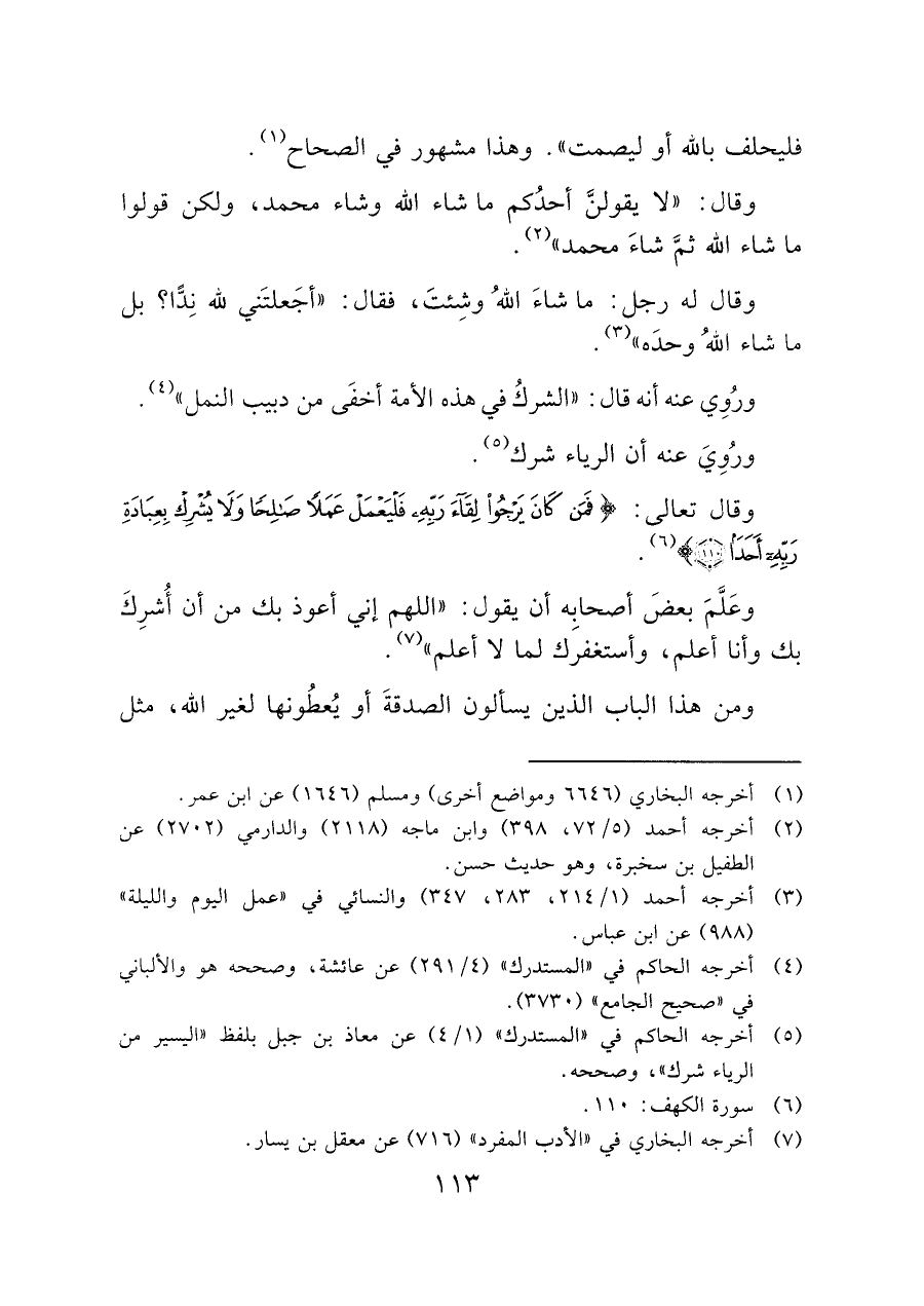 ورُوِي عنه أنه قال: "الشركُ في هذه الأمة أخفَى من دبيب النمل" (¬٤).